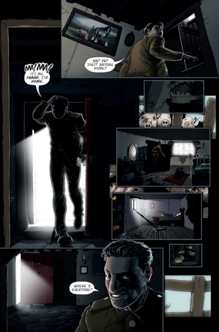 The artwork for the series is perhaps a little hit and miss in places, but never enough to pull you out of the story, and I have to say that when it is good, it’s downright terrifying and disturbing on a level that I really wasn’t expecting. Throughout the last three issues, Clark Bint has consistently shown moments of brilliance in both the layout and the character/creature design. When I was a kid, I used to visit my aunt and uncle’s farm, and some of the animals were genuinely scary. There is nothing pink or cute and cuddly about most pigs; they are huge, vicious and could swallow a child whole. Oh, and don’t get me started on the cows and that constant side-eye they give you!
