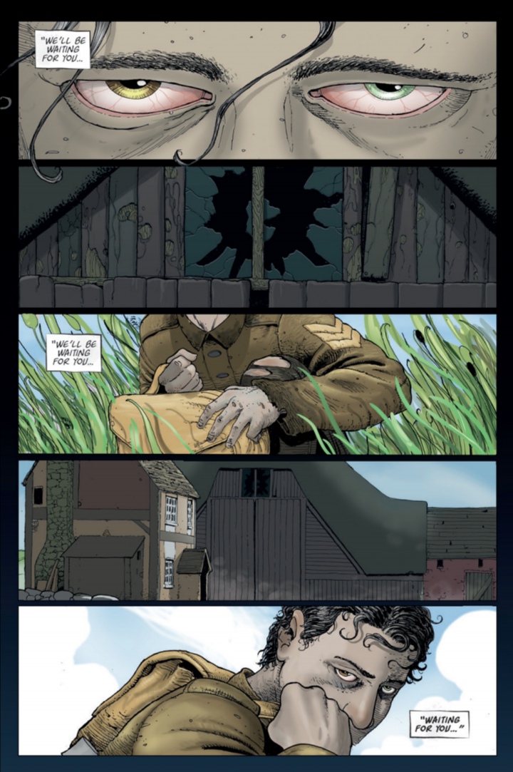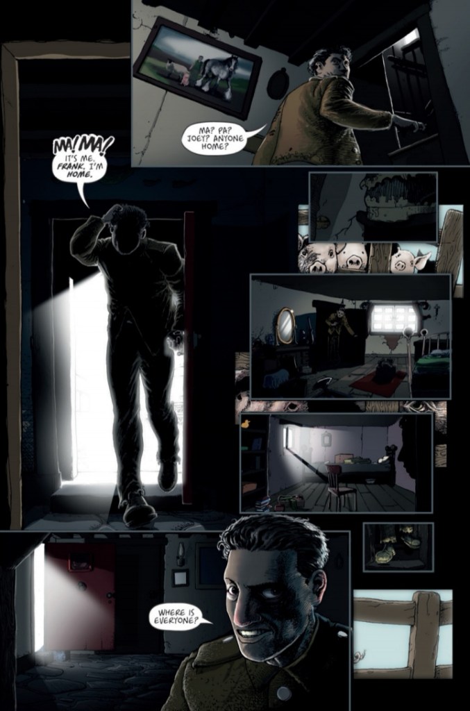 We’re due a Kickstarter for issue four of this series shortly so my editor asked me to take a look at the first three issues of Frank at home on The Farm. This is my first foray into Jordan Thomas’ world, and I’m genuinely impressed with these first three issues. This is a really well thought out and constructed psychological horror story that really keeps you guessing as to what is really going on. There are two very obvious possibilities in that regard, the first being that Frank is suffering from shell shock. Having just returned from service in WWI, it would be easy to assume that Frank is translating the trauma of his experiences into the nightmares and fantasies that have been assaulting his senses since his return. The second possibility is that Frank has actually returned to a twisted, more disturbing version of George Orwell’s Animal Farm.