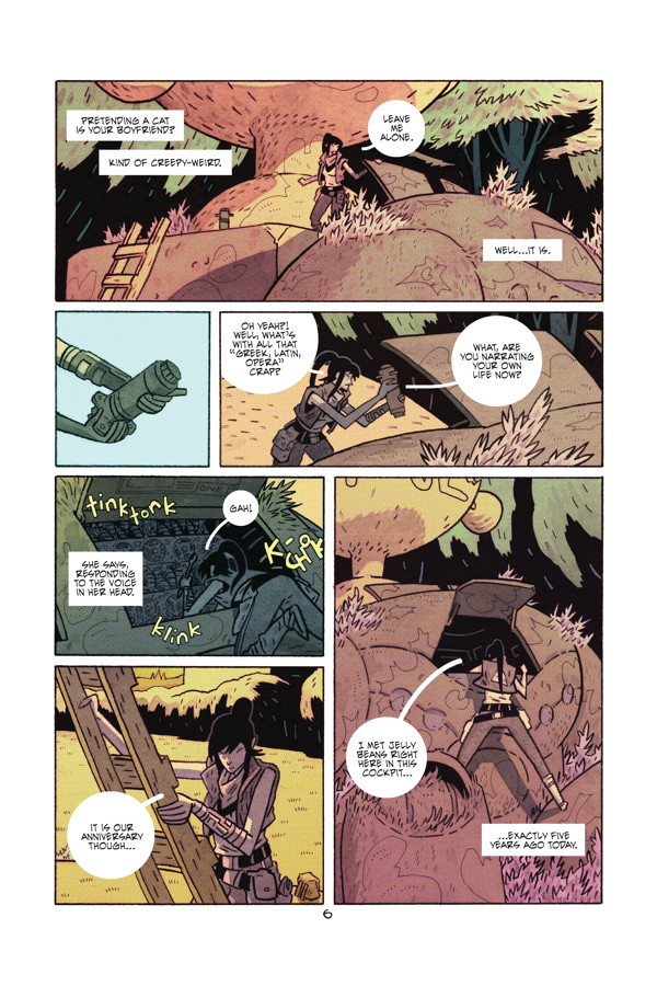 The main story runs the whole gamut of emotions throughout its 96 pages, from light-hearted humour to powerful human drama before ending with an impressively poignant finale. In Aria, MacLean has created a truly fascinating protagonist; a smart, silly young girl who, in spite of her outwardly upbeat appearance, is clearly struggling with the loneliness and isolation of her mission. Her often one-sided relationship with Jelly Beans is likely to be more than familiar to any cat owners out there, as is the powerful bond she has formed with her feline best friend.