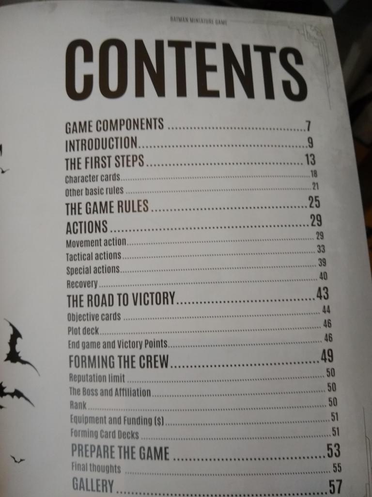 Opening the box, you are faced with two books: a purple START HERE Joker-themed intro campaign, which takes you through all the basic rules adding complexity at each step, and the main rulebook (also available online for free). The mini-campaign is an excellent introduction, and structurally it’s very reminiscent of The Walking Dead (you can spot Mark Latham’s fingerprints all over this). The back of the intro book includes clear construction guides for the figures and terrain also.