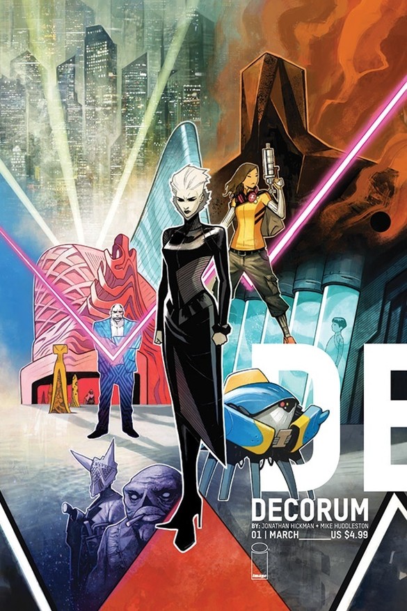 Decorum, a brand-new Image Comics series on sale this week from Jonathan Hickman and Mike Huddleston, lays out the scope of its world-building from the very first page; an all-text summary of the state of the galaxy and the myriad attempts at setting up “Preserves” – where a planet’s inhabitants are kept in a basic approximation of their original habitat – an undertaking which has had decidedly mixed, and frequently genocidal, results.