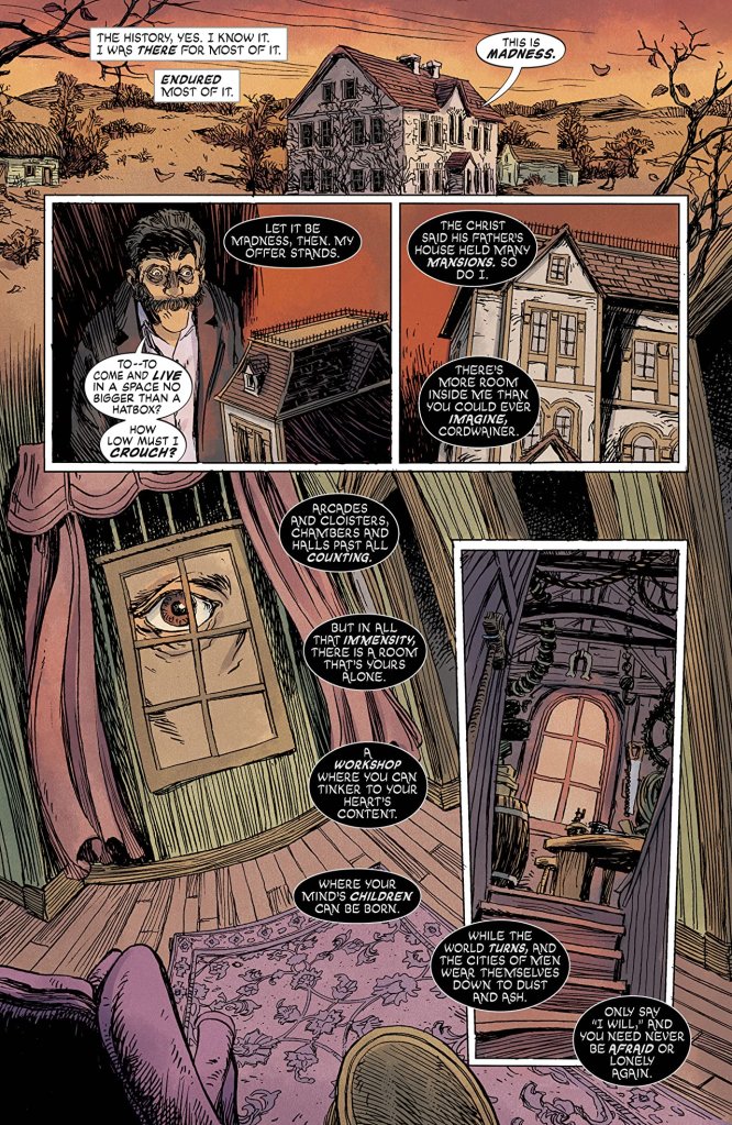Alice’s arrival in Ireland comes with a series of surprises, the least of these being that she is the sole heir to her Aunt’s estate – and also that of Joseph Kent – and this is the point where the story steps up to a whole other level. There have been two timelines running throughout this series so far, and this issue brings them both together, merging ghostly visions of the house on the night of Cordwainer’s birth, and finally revealing the origin of the Dollhouse. I’m not even slightly exaggerating when I say that this reveal was the most unexpectedly Cronenberg thing I’ve seen since I read Lonnie Nadler and Zac Thompson’s COME INTO ME.