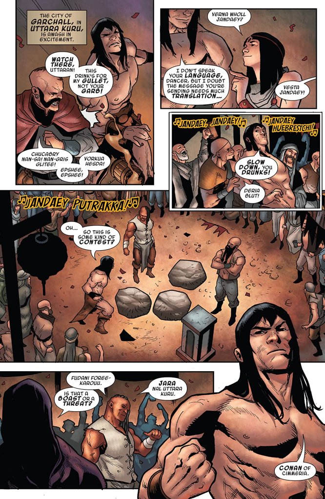 Once entombed inside this maze of traps and horrors things get really interesting, with Zub impressively introducing the audience to his plot’s substantial supporting cast with just a few lines from his pen, and a string of quick-fire panels proficiently pencilled by Brazilian artist Roge Antonio. This “strange group of conscripts, captives, murderers, and maniacs” immediately imbues this comic with an air of palpable apprehension, as both Conan and bibliophile alike know not who to trust, despite none of the other “honoured competitors” having “a single weapon between them.”