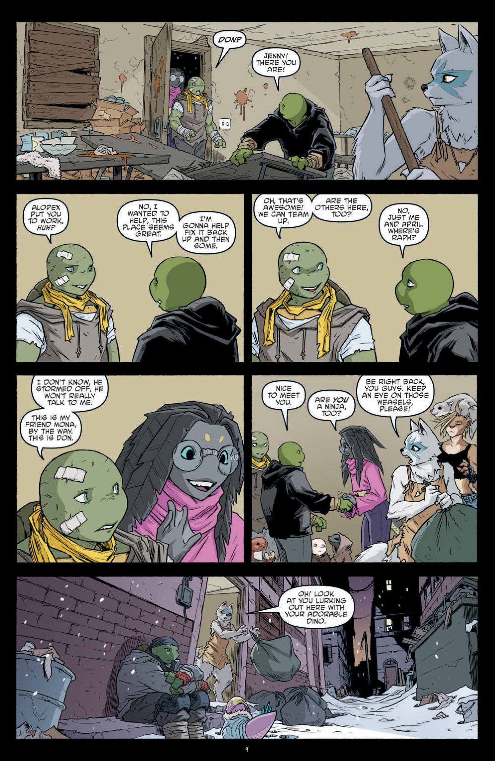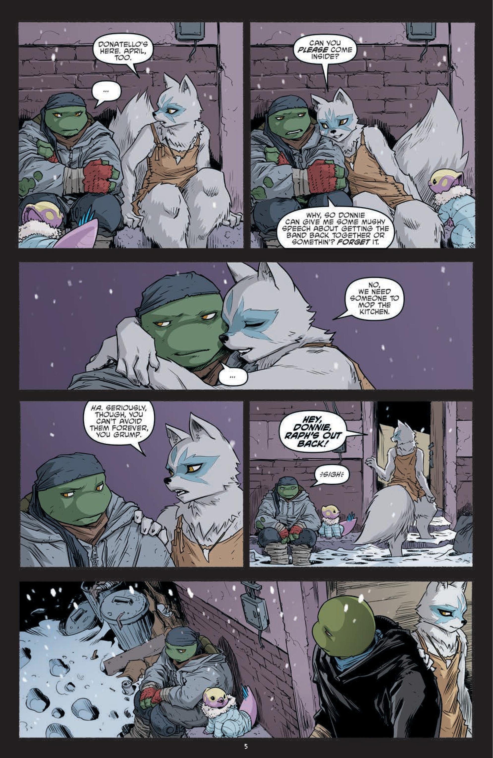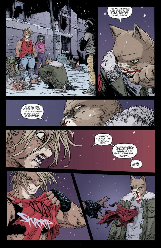 With Sally Pride putting Hob firmly in his place at the end of the previous issue, the opening of this latest chapter of Sophie Campbell’s TMNT run feels very much like a change in direction and tone. Yes, things are still incredibly unpleasant for the inhabitants of Mutant Town, but there’s an uptick in positivity here, from the befriending of the rather cute would-be ‘child soldiers’ to the touching exchange between Raph and Alopex you can see in the preview below. However, in this instance, these moments are merely the tip of the emotional iceberg.