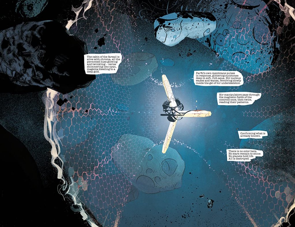 For starters, “Breaker Of Worlds” is initially an incredibly slow-tempo tale, which diligently dwells upon the desolation of space surrounding the alien entity Par%l, since the Hulk brutally murdered the Sentience of the Universe and subsequently started destroying all life in creation. Admittedly, this perhaps understandably depressive listlessness concerning so forsaken an environment is momentarily brought to life when the extra-terrestrial encounters his former lover, Farys, on board the Observer’s Berth. However, such a claustrophobic atmosphere of cheerlessness soon returns as the couple’s strained relationship quickly sours even further, following the “skilled breeder of Tiding-flies” creating something her former partner vehemently opposes; “The egg feels grotesque. Heavy with corruption, Obscene in power… You… You have made an abomination.”