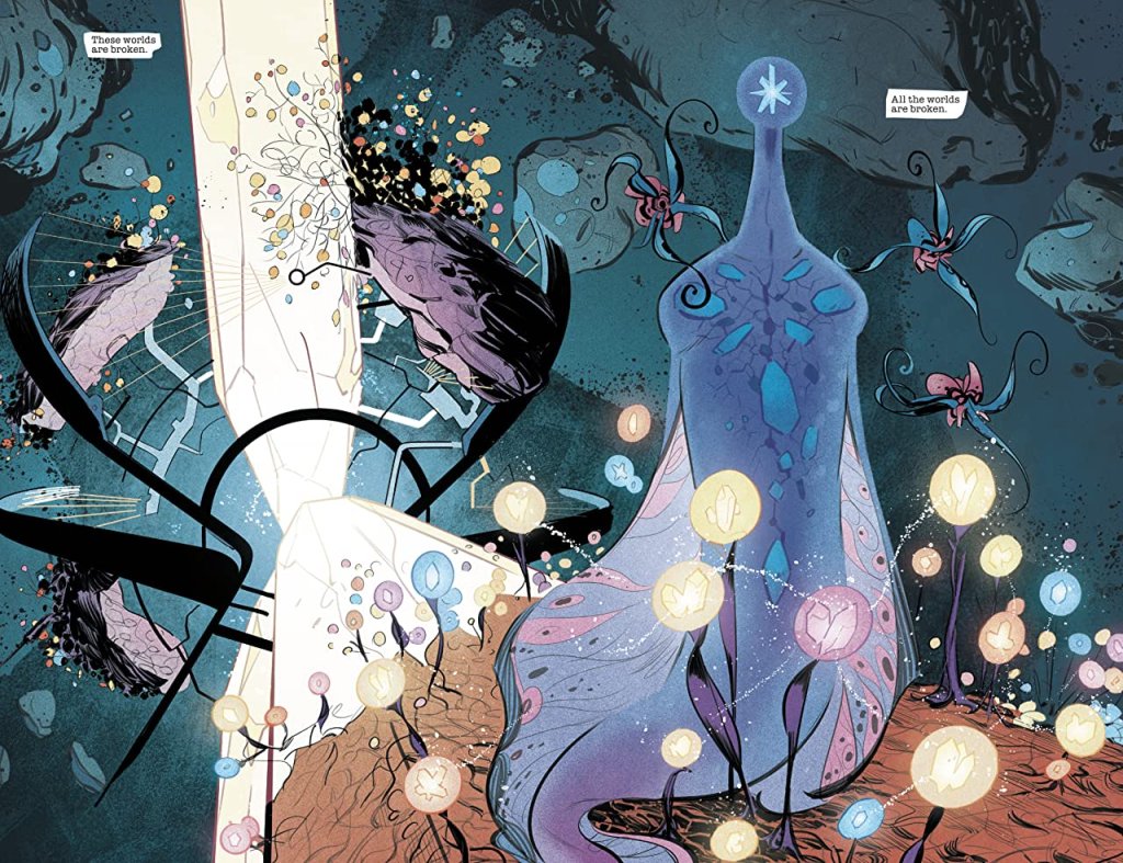 Adding to this book’s sedentary story-telling and palpable sense of lethargy are German Garcia’s debatably lack-lustre layouts. Whether you agree or not with Ewing that the freelancer’s “work is absolutely gorgeous” and produces an “intensely, magnetically beautiful” look to this comic which makes Par%l’s world “really feel alien”, the Spanish artist’s significantly padded-out, double splash-page illustrations predominantly seem to have been pencilled just to help fill out this gargantuan doubled-sized issue, rather than simply help illustrate “a comic the likes of which has never been read before.”