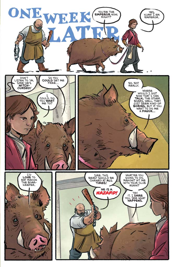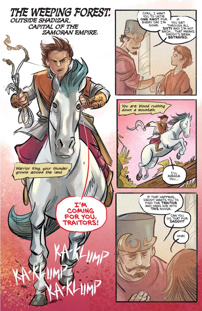 That’s perhaps the main thing that I really missed the first time I read through the comic. This sweet, cherubic child who I actually found myself liking, does some pretty appalling things in this issue, including ordering the torture and murder of anyone that might have the smallest scrap of information to aid him on his quest. Cyril ultimately isn’t a good person if you really think about it, but he is only a child, and a child that has been brainwashed by his father and a culture that venerates swift and merciless vengeance. Also, as a child he still sees things without the temper of experience or the shades of grey that an adult would recognise, everything is a grand adventure and he is the hero of his own story.