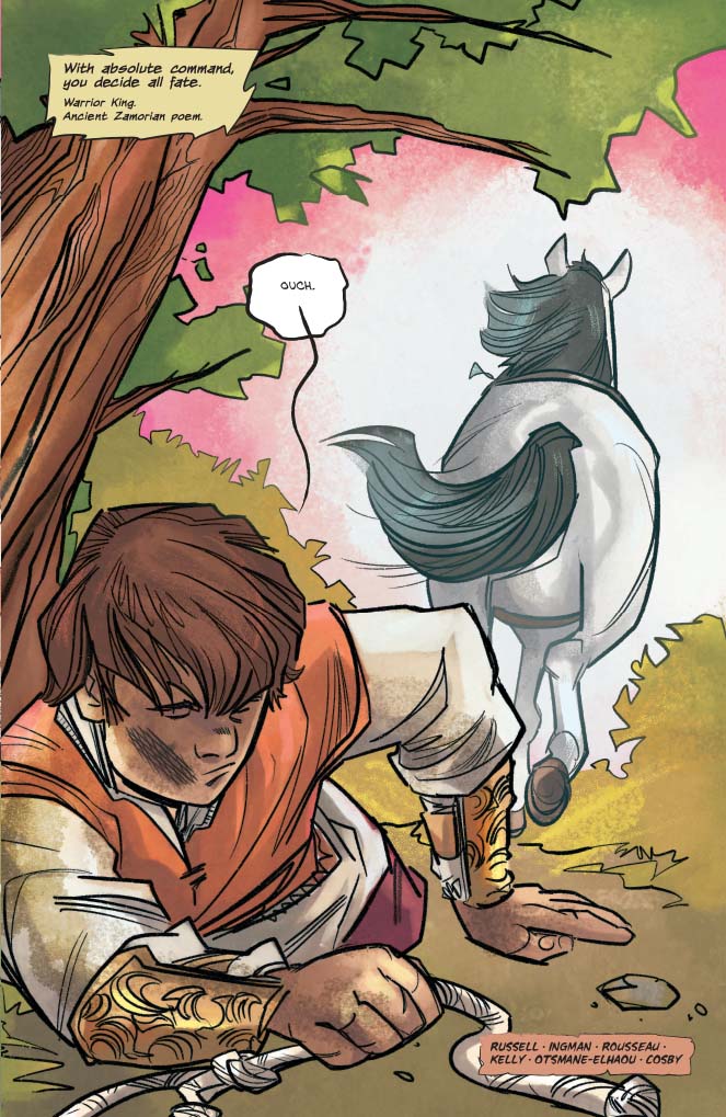 As a Teen+ title, this is a very different style from the Red Sonja tales that I’m used to reading, and if I’m honest, it took me a couple of read-throughs to fully appreciate what the creative team are delivering in this first issue. While this is still very much a Red Sonja story, it is one being told from the point of view of a child; a child that has been taught only the war stories and beliefs and code of vengeance that his father has drilled into him.