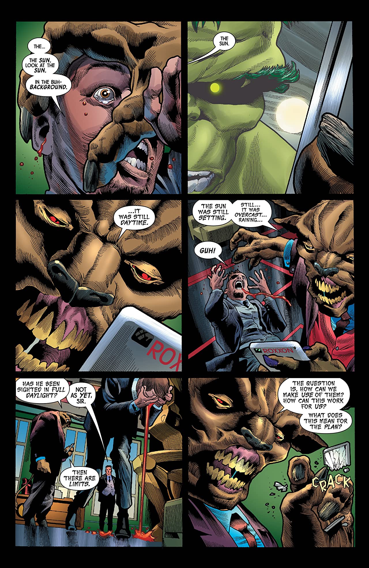 Similarly, the machinations of Roxxon Energy Corp’s mutated CEO could equally be accused of being a little word-heavy. But unlike the other two aforementioned sub-plots, the scenes involving Dario Agger are packed full of pulse-pounding menace, as the Minotaur almost literally squeezes the life out of his faithful advisor Randolph when the man foolishly delays informing his formidably-sized boss that the titular character can now walk the earth whilst it is still daytime. As a matter of fact, it’s a pity that ‘Eat Or Be Eaten’ doesn’t provide the Greek super-villain even more ‘screen time’ than he gets here, as the increasingly insane industrialist plans an attack from the Roxxon Plaza in New York whilst drinking a glass of wine and mulling over the fact he’s unable to travel with his gargantuan nightmares, or to “savour the terror” they will undoubtedly cause amidst the general population.