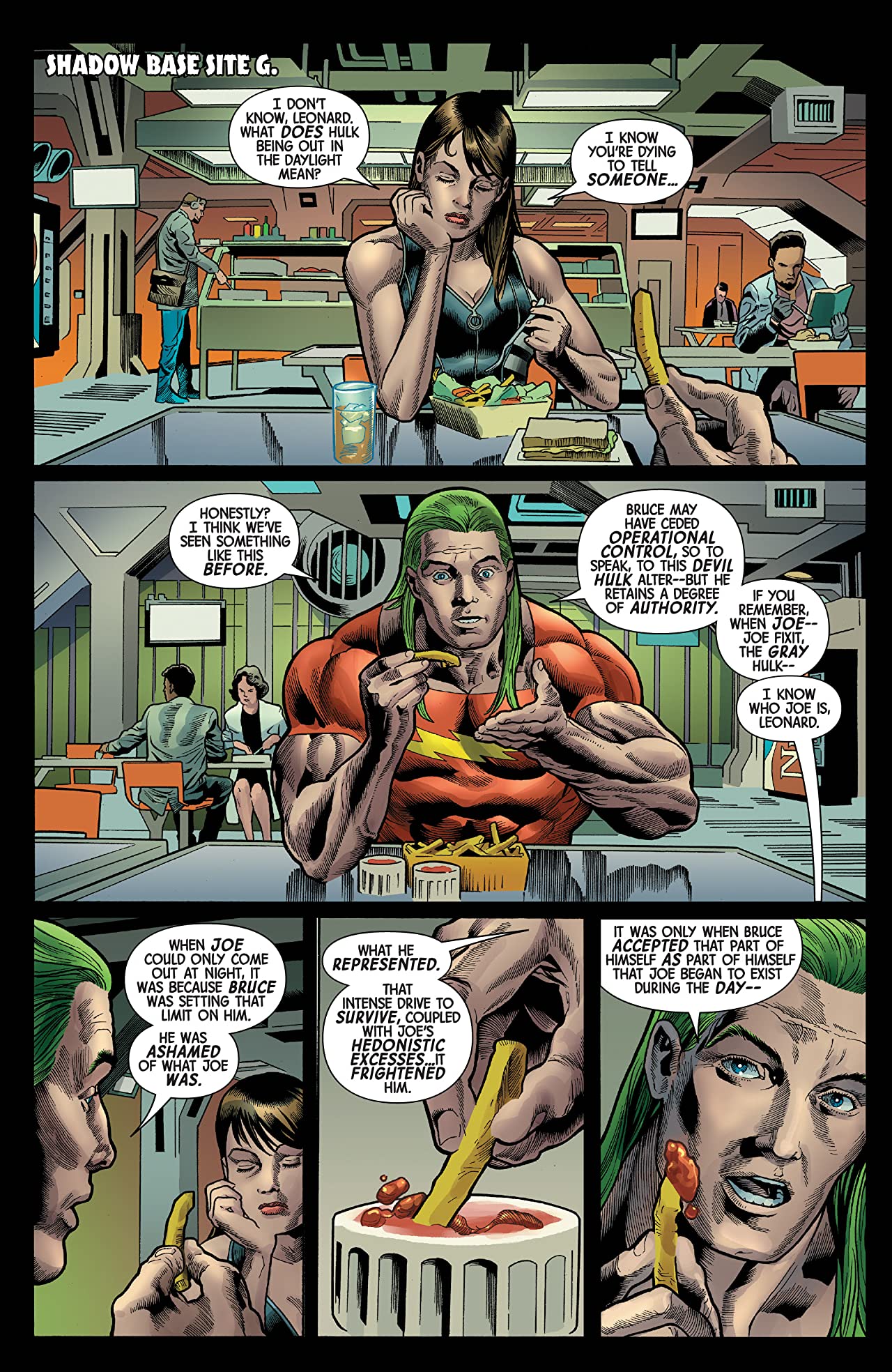 In answering such questions as just how active the Devil Hulk can be during the day now the persona seemingly somewhat trusts it host Bruce Banner, Al Ewing’s pacing for much of this twenty-page periodical was perhaps a bit too sedentary for the majority of this book’s 46,484 readers. Indeed, coupled with a lengthy dialogue-driven sequence involving Jackie McGee and her worried editor Murray at the Arizona Herald, this comic’s entire opening half is arguably something of a snooze-fest, which slowly plods its way through the notion that the nuclear physicist’s alter-ego is starting to think “about other people and their feelings”, as well as the female reporter’s acceptance that the green Goliath created “the stress [which] probably killed my father.”