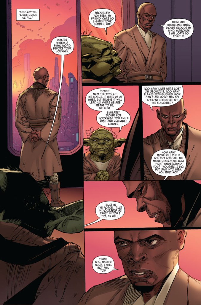 Some of the dialogue is a little overwrought at times, an approach which seems to work a lot better on the big screen than it does on the printed page. Windu himself comes across as a little clunky and earnest, while some of his team – Rissa Mano in particular – utilise a contemporary style of talking that perhaps feels like it goes a little too far the other way. We’re also given some jarringly comedic dialogue courtesy of the battle droids, and while the big screen versions were never exactly the most serious of threats, their comic book counterparts and their witty banter make it fairly difficult to take the otherwise awesome black ops Jedi incursion seriously at times.