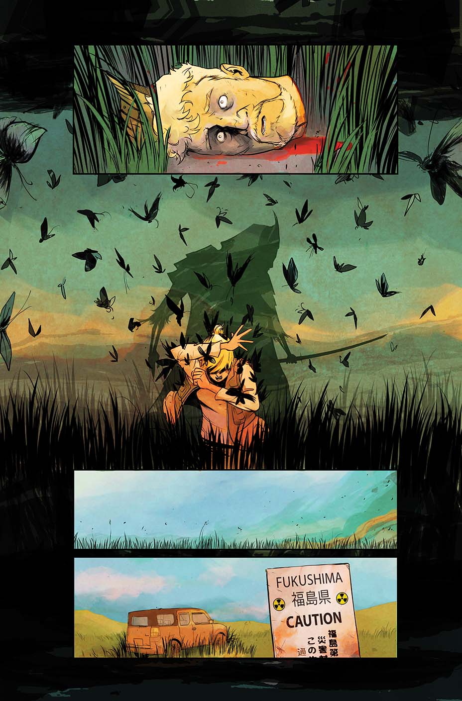 Disaster Inc. follows the story of a company offering such risqué expeditions. Now I’ll be upfront and say that on that premise alone I was super keen to get my hands on this. I’m not overly familiar with Harris’ previous writing, but the sample art and lettering from Piriz and Mangual looked good, and I’ve always appreciated the appeal of roads less travelled; even if I wouldn’t walk them myself. In all honesty though, when I read more and found out this would be focused on Fukushima and the potential for spectral samurai, my enthusiasm took a wee bit of a knock. I was thinking more Hills Have Eyes, but I was still prepared to give it a try. Truth be told, I’m glad I did.