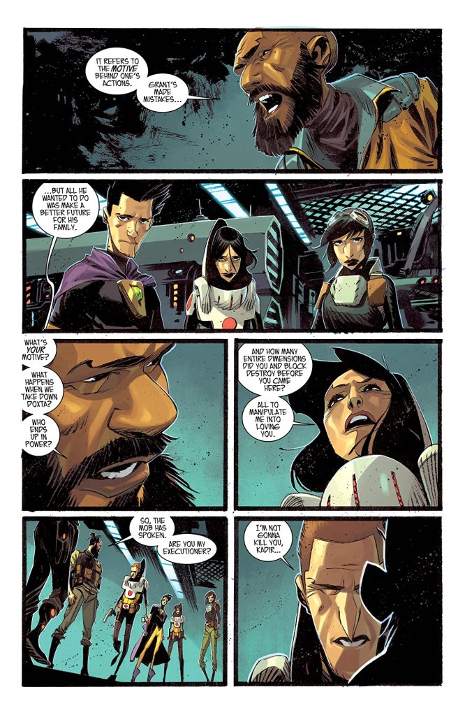 With the focus essentially narrowed down to our primary protagonist and antagonist, Remender and Scalera employ a clever branching storyline method where two alternate versions of one key decision play out simultaneously. Previous events are referenced, added emphasis is placed on certain developments, and the whole thing loops around on itself in one glorious final swoop, leading to a final double-page splash that is every bit as resonant as it is cryptic.