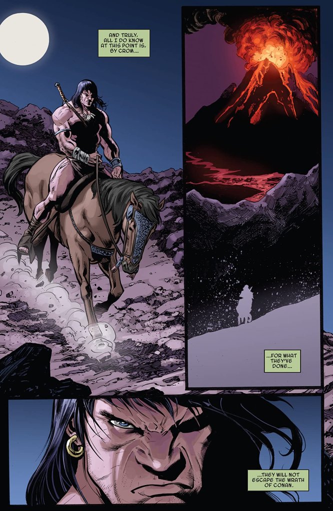 Adding to this plot’s vibrant dynamism and persistent air of impending doom is Andrea Di Vito and Scott Hanna’s artwork, which are simply spectacular, especially when it comes to Conan’s battle with the incredibly strong, almost serpentine-shaped Amoth. The adventurer’s desperate effort to reattach the fearsome fiend’s transformation-thwarting collar is nail-bitingly pencilled, and doubtless many a bibliophile winced at the impact of the Barbarian head-butting the red-eyed brute into submission; “Fortunately, my hard Cimmerian head can likely aid in the process…”