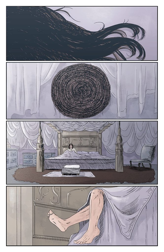 BCP: Jenna, I made quite a fuss over your artwork in my reviews, I particularly loved the way you used the huge and expansive landscape to define the isolation of Eulalie while simultaneously making it feel crushingly claustrophobic. How much input did Lonnie have on what you produced and was there a particular influence or reference you used?