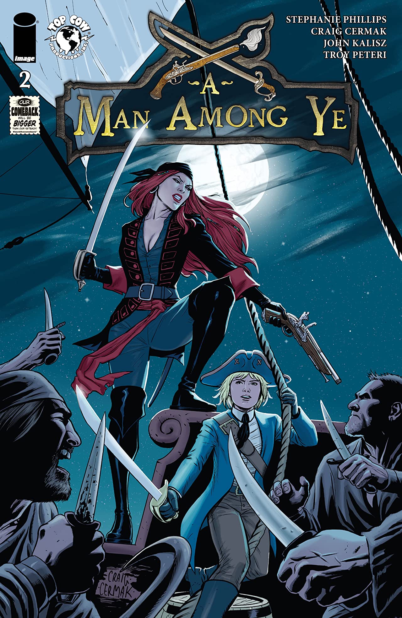 Craig Cermak’s artwork is also impressive throughout this comic, with the co-creator of Red Team clearly putting plenty of thought and energy into his panels. Indeed, few perusing bibliophiles spying the illustrator’s tremendous sketch of Read’s father being blown sideways by a pirate ship’s cannon fire would likely be able to stop themselves momentarily wincing at the perceived sound of the ball blasting its way through thick wooden timbers, or later slightly sway in the high winds as Mary takes her “first sip of the demon rum” on the main mast.