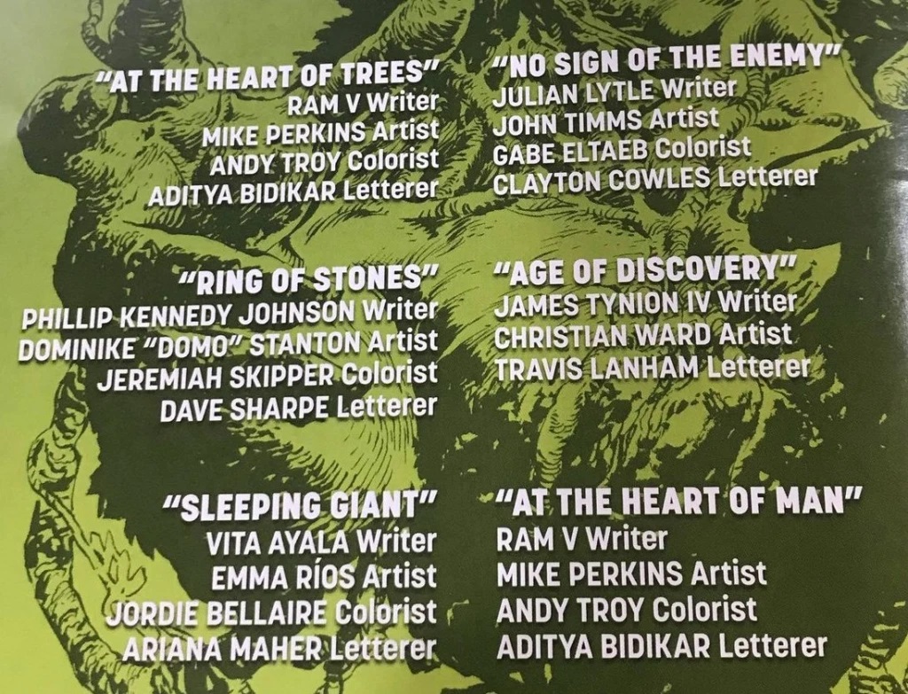 We kick things off with the strongest story in the book, with Ram V taking the lead on a Swamp Thing tale packed with familiar themes and imagery going back to the days of the Alan Moore run. More familiar themes are quickly added with a Grandmother Willow-like character taking a warm yet haunting secondary role. Forgive my vagueness, but with each story being 8 pages at most, I’m treading lightly to avoid spoilers. Ram has done a great job here cementing a strong, familiar path for Swamp Thing readers to follow. The art provided by Mike Perkins with Andy Troy is astounding and leaves me lusting even harder for a new Swamp Thing monthly series. Oh, and don’t forget Aditya Bidikar who has cemented his place as my favourite letterer of the moment after his work on Image’s Department of Truth. This opening story leads us into a reflection of the many lives of the Swamp Thing.