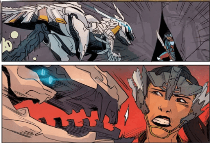 Issue one introduced us to the Sawtooth and its downfall at the hands of Alloy and Talanah. Looking back, it was a very quick read almost purely designed to introduce us to a mechanical variant the Sawtooth and the hunting natures associated with it and to promote interactions for Talanah in future panels. While I don’t want to give the whole story away, the nature of each beast is core to the story as a whole. The major threat is all based on the predatory nature of a new variant of creature known as the ‘Dark Armoured’. Long story short, displays of aggression grows into further aggression and the new rank of beasts attract some unwanted attention.