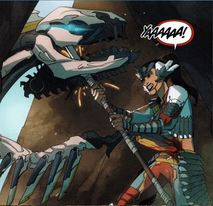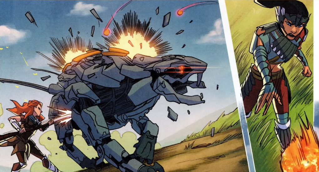 The Collectors Guide explains that any type of machine that reaches a body count high enough will be permanently improved and produced in greater quantity. Is this where the Dark Armour upgrade comes from? All we know is the Dark Armoured is more threatening, shows more hostility towards those who hunt and that there is a variant for each of the species. The final issue of this series also introduces us to a machine that was introduced in the trailer for the new game Horizon Zero Dawn: Forbidden West. For those excited for the upcoming game, this is a must read, and for those excited in the potential of more comics, the final issue leaves plenty to encourage further reading.