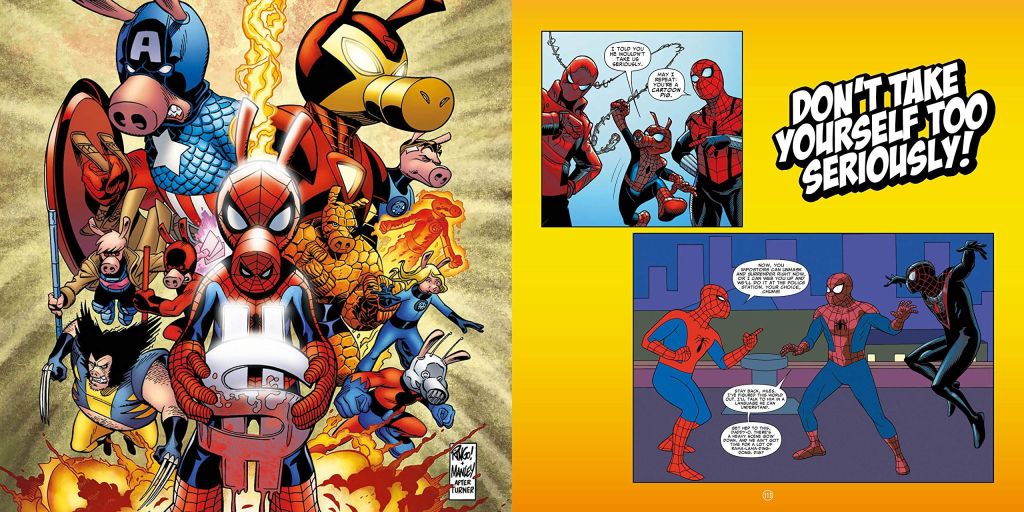 For a little context, the book is split into eleven chapters, each taking a look at a different aspect of Spider-Man, from his powers to his relationships to some of his most memorably team-ups. Our exclusive page is from chapter three: “Spider (Fashion) Sense”, which – as you might have guessed – takes a look at some of Spidey’s coolest, weirdest and most embarrassing outfits over the years.