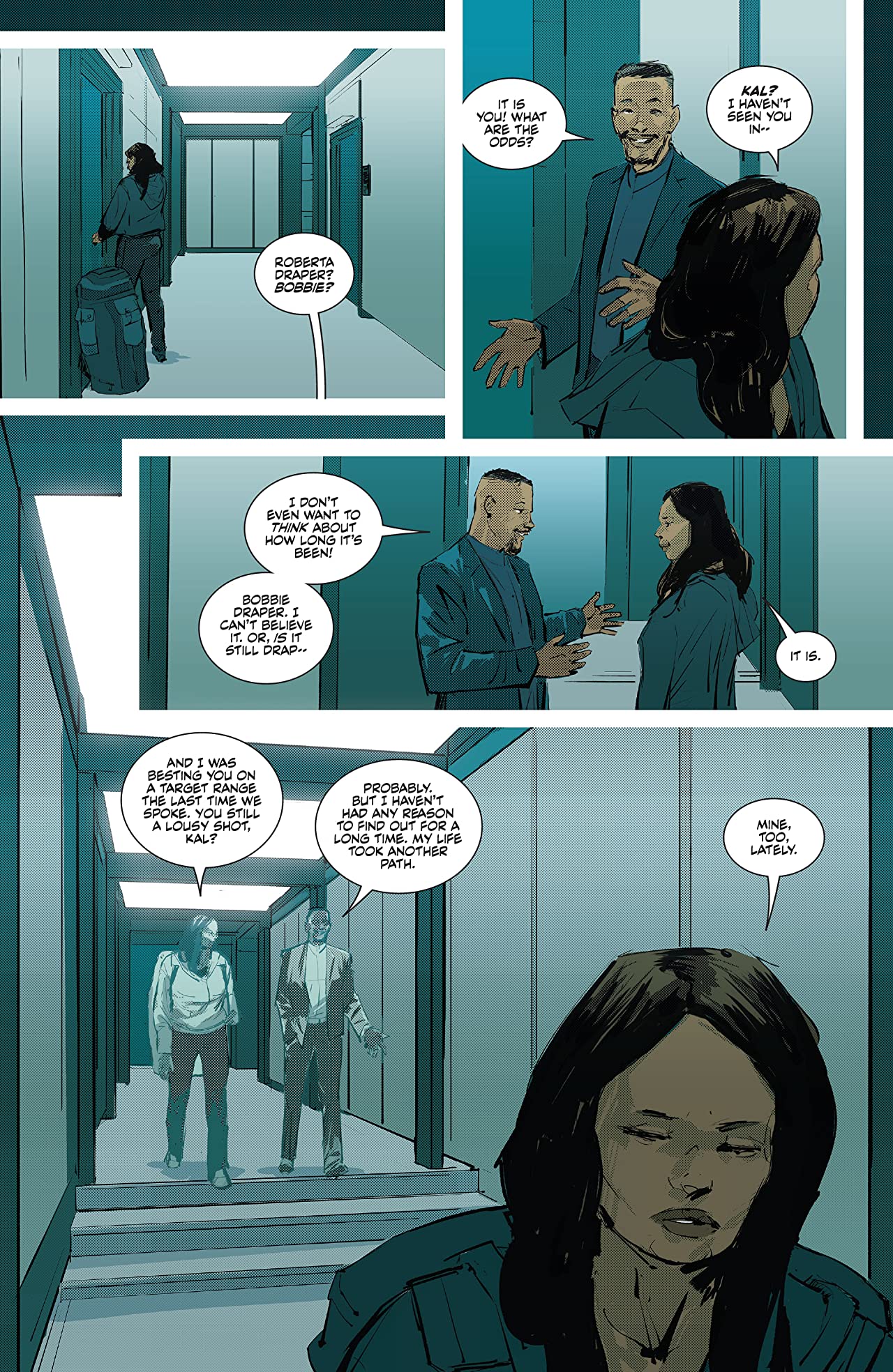 For me, the action scenes towards the end of the issue are where the art really cranks up a notch. Combat and firefights are gritty and dangerous, and we are up close and personal when the bullets start flying. The choice of angles and points of view really serve to maximise and explore the space, bringing a sense of dynamism as opposed to sedentary corridor shoot outs.