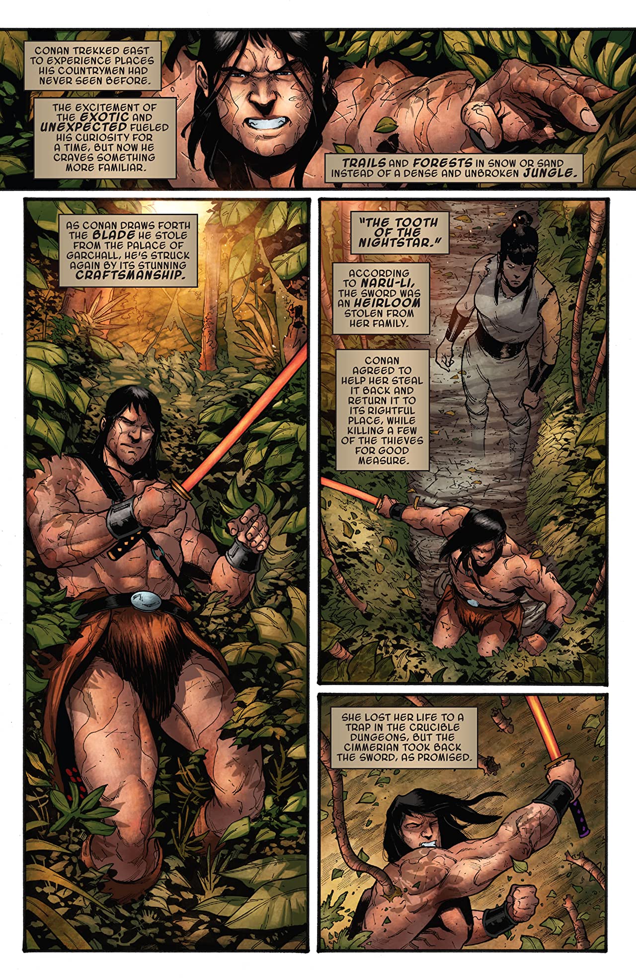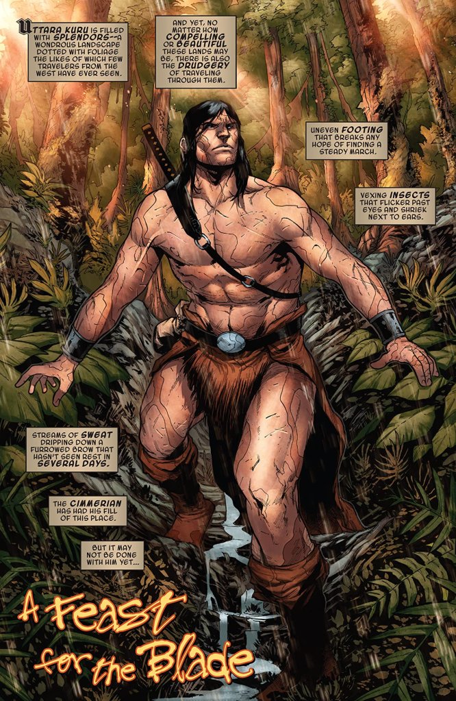 Zub’s writing also provides a good sense of the internal conflict taking place within our hero’s head. As highlighted in the comic itself, “the Cimmerian senses foul magic in the air” when his “gaze rests a moment upon the blood-tinged metal”, and for an instant Conan’s formidable strength of will would appear to have prevailed as he angrily abandons the Nightstar to the ever-enclosing woodland about him. However, the warrior quickly fools himself into believing he actually needs to have the sword if he is ever going to survive the dangers of the strange land he’s currently traversing, completely forgetting that he could always have taken the double-headed axe from the bandit he blindly dispatched just moments before forsaking the haunting piece of sharpened steel.