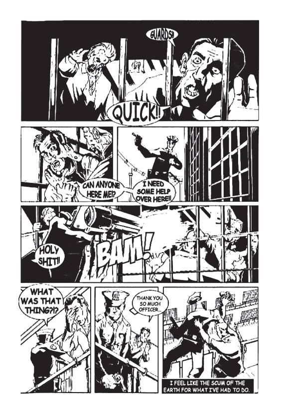 Equally as dark, though somewhat lengthier than the long-dead chronicler’s all-too brief appearance, is the personal account of Doctor Madison Wilde in “I Did It All For Him”. Penned by Travis Gibb, this penitentiary-based nightmare depicts just how the utterly deluded prisoner manages to orchestrate his largest controlled experiment to date inside an incarceration facility following the discovery that his son has been transformed into a zombie. Intriguingly drip fed details of the disgraced medical practitioner’s plan bit by bit, this gruesome yarn genuinely gets the periodical off to an enthralling start, and is arguably only let down by some of Juan Pablo Milto’s somewhat unclear, scratchy-looking panels.