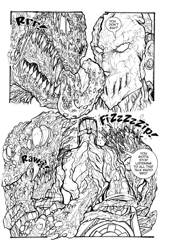 Finally bringing this gore-filled graphic novel to an end is Jonathan Hedrick’s “Freakshow Princess”. Initially appearing to contain a quite simplistic tale of a woman and her pet dog somehow surviving the apocalypse inside their claustrophobic bungalow, courtesy of the now dead Chris’s procrastination in building the dwelling a functioning garden deck, this deeply demoralising story ends with a tragic twist which really pains the heart, and probably brought many within the book’s audience back down to Earth with a resoundingly loud bump; “The freaks found a way in! She’s starving. I have been so worried about feeding myself that I neglected her.”