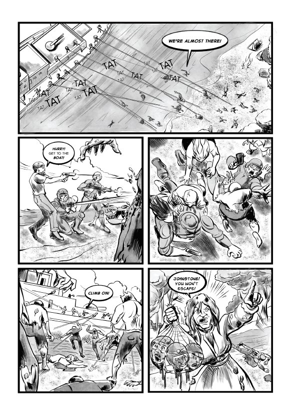 Setting up a strong second half for this corpse-laden compilation is “Return To Horn Island” by Marcus H. Roberts. Clearly penned as something of a sequel to “Zombie Attack On Horn Island” from this title’s previous volume, this twelve-pager rather neatly weaves America’s current obsession with building a great wall “to protect the country and its citizens” with the fate of a man whose great, great grandmother somehow managed to survive the aforementioned assault on the nation’s earliest settlers by an old witch woman. Dynamically drawn by Dan Gorman, this yarn doesn’t debatably contain any surprises for those fear-fans familiar with Roberts’ earlier adventure, as it seems clear from the very start that the military’s decision to turn the island into a safe haven for evacuees isn’t going to go down terribly well with its brain-eating inhabitants; especially when the General decides to split his forces so as to get the clearance job done in double-quick time. But it is still enormously entertaining watching as the elite seal team soon realise that their automatic weapons are no match for a horde of flesh-eating creatures who can tear a man’s still beating heart from out of his chest despite the soldier wearing advanced body armour.