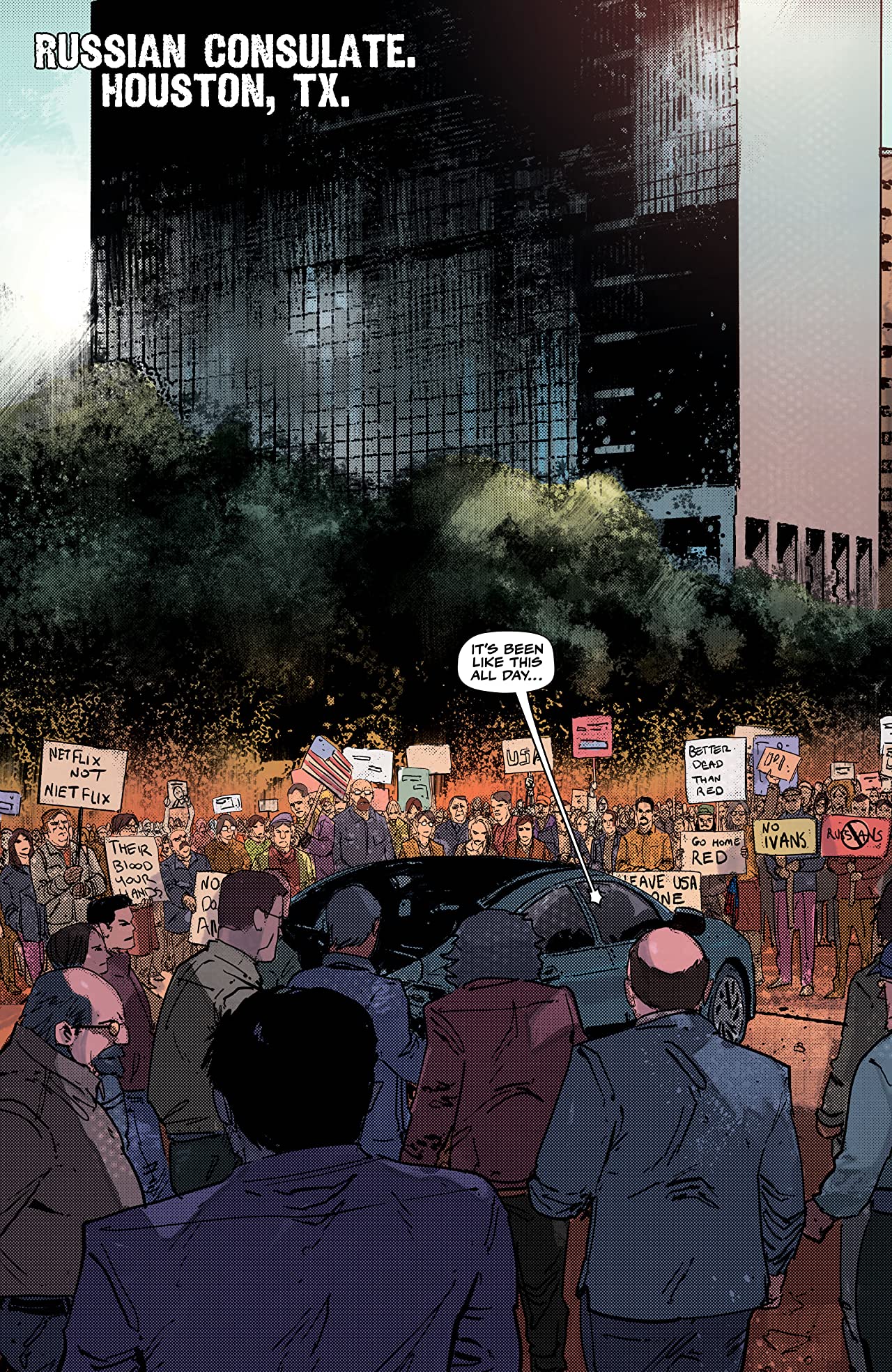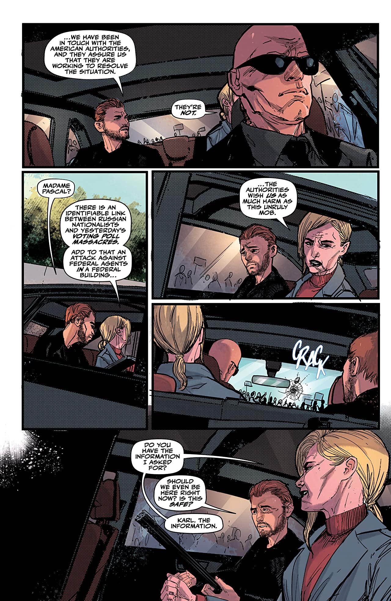 Robert Carey and Rosh continue to provide excellent artwork for this series. The aesthetic has a satisfying neo-noir feel to it which is just gritty enough for a Cold War thriller without making it seem dated or out of place with its modern day setting. As I am very much playing catch-up with this series, I’ve binged the first three issues over a single weekend, and the character design is really good and consistent throughout. Each character is very well defined, they’ve all got their own personalities, ways of moving, and personal ticks which, given the number of characters it looks like we’re going to be seeing regularly, is a gift. This is something that is not often the case with a large cast, and it’s refreshing to see that Carey and Rosh have made it really easy for the reader to keep track of who is who. There is also a surprising amount of detail in the panels and pages, little things that probably go unnoticed for the most part but go that extra mile in providing this story with an added sense of reality and believability.