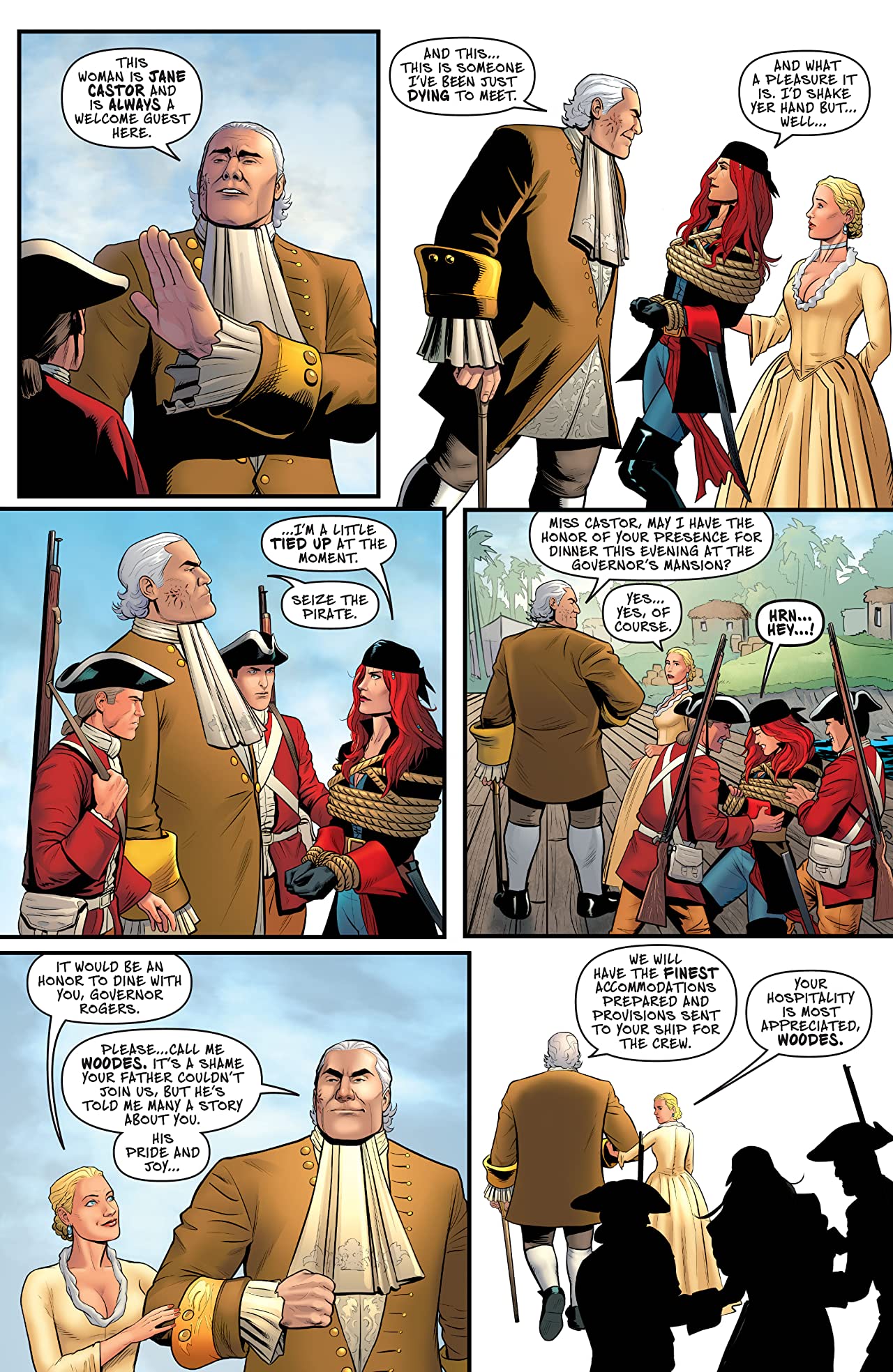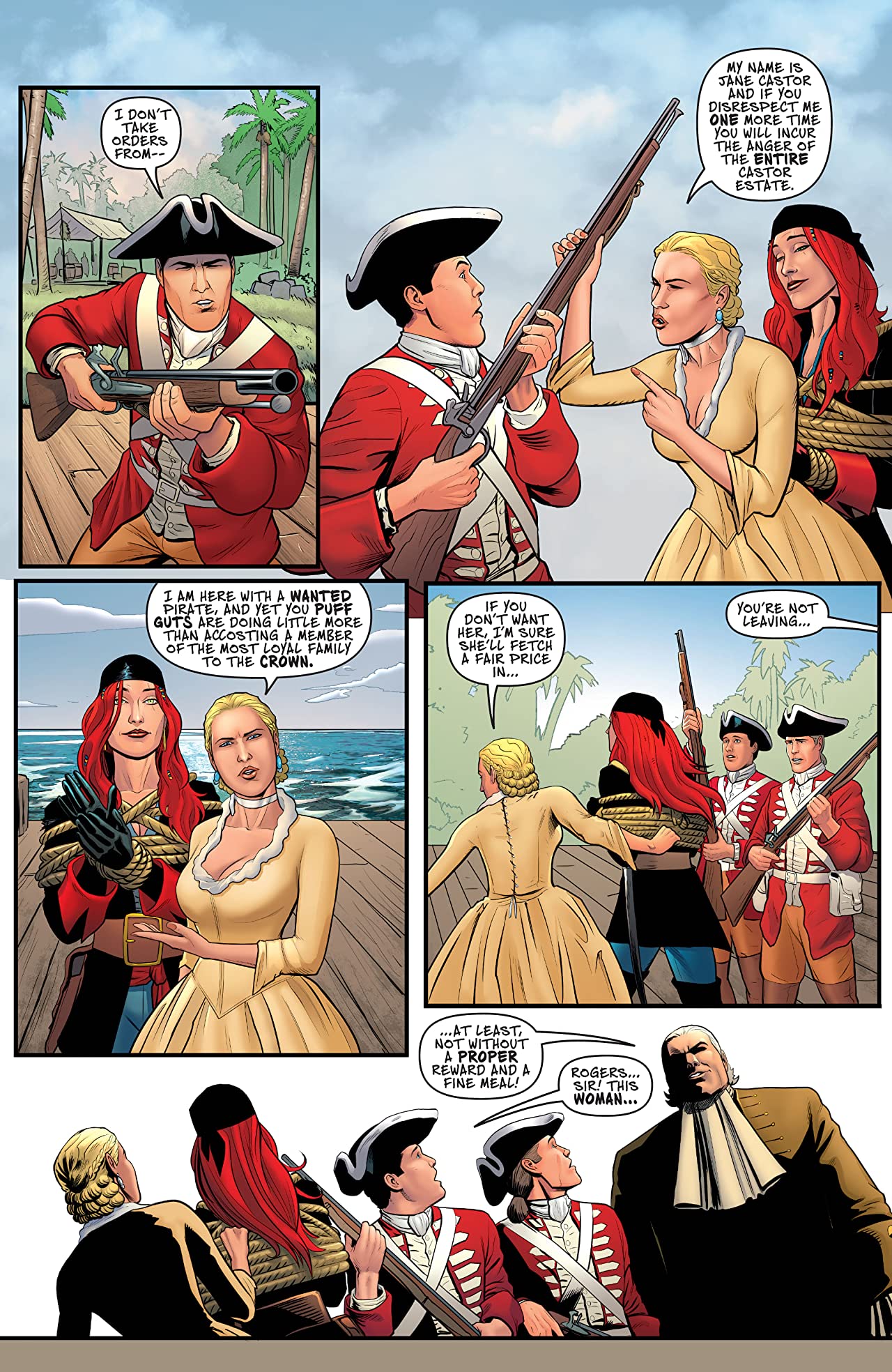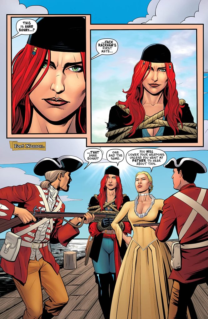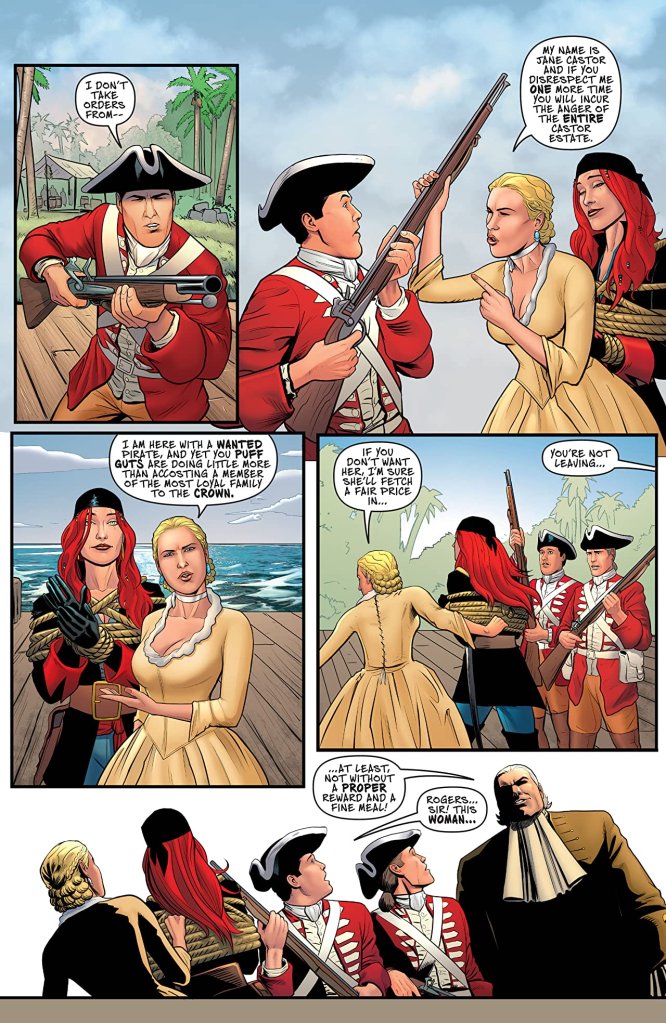 Much of this publication’s success stems from the writer steering well-clear of lazily having this mini-series’ lead protagonist steamroll her way through Woodes Rogers’ forces, regardless of the governor’s formidable firepower, sizeable fleet and numerous soldiers. Instead, Bonny uses her brains to infiltrate the dauntingly defended stronghold, and rather cleverly latches onto the story of the Fall of Ancient Troy as told to Mary Read by a friendly sailor on the night her father was murdered by brigands; “The Trojans took the horse into their impenetrable city, only to have Greek warriors climb out of the horse once night fell.”