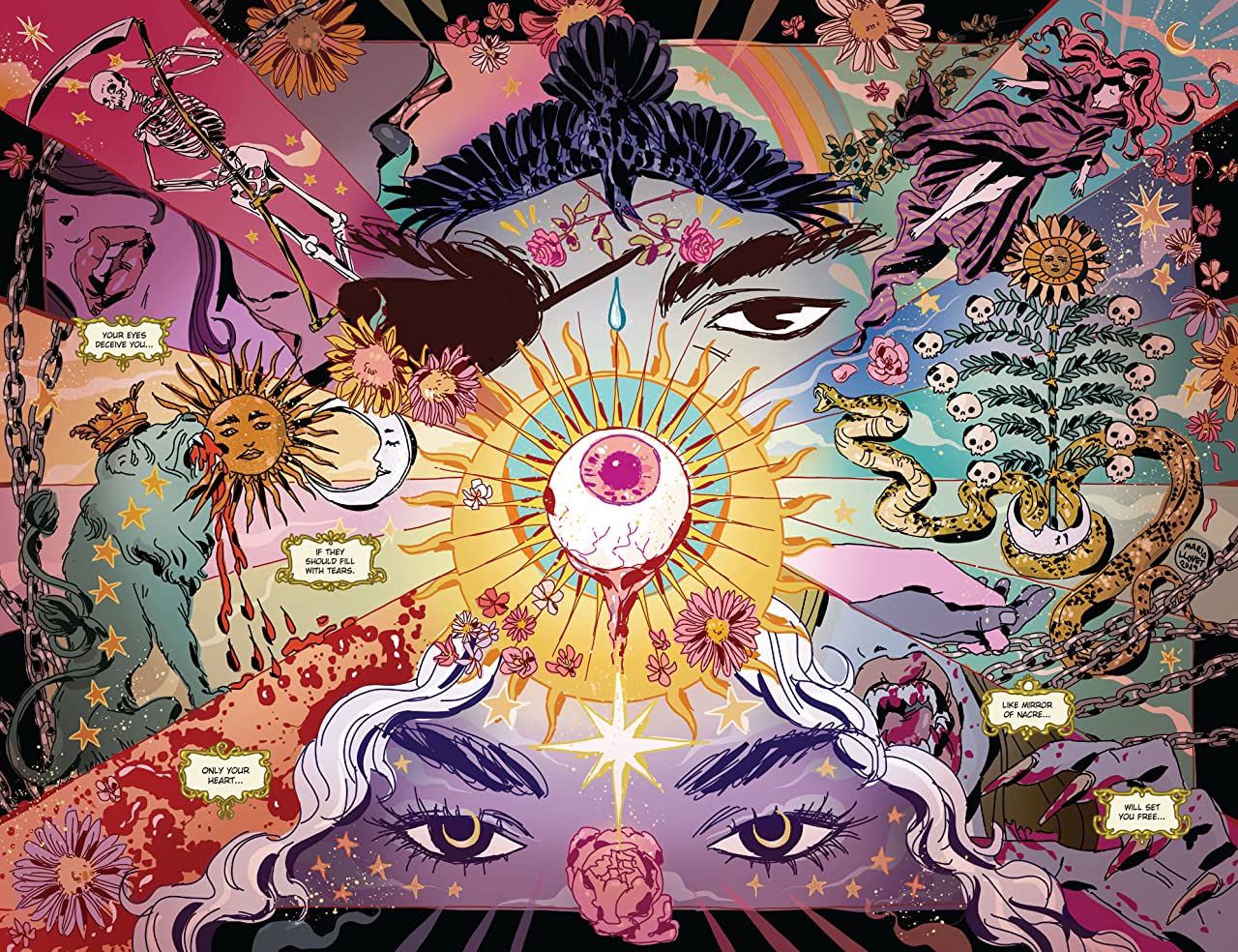 On top of this we have the magical (or should that be spiritual or mythical?) mind-bending panels as we explore deeper the reasons surrounding this little piece of Eden in the desert. What could have slipped into comical, stereotypical narcotic-induced visuals instead has us question the blurred lines of reality. What are these women’s stories? How did they all come to find each other and what’s the deal with the cave and the surrounding bounty?