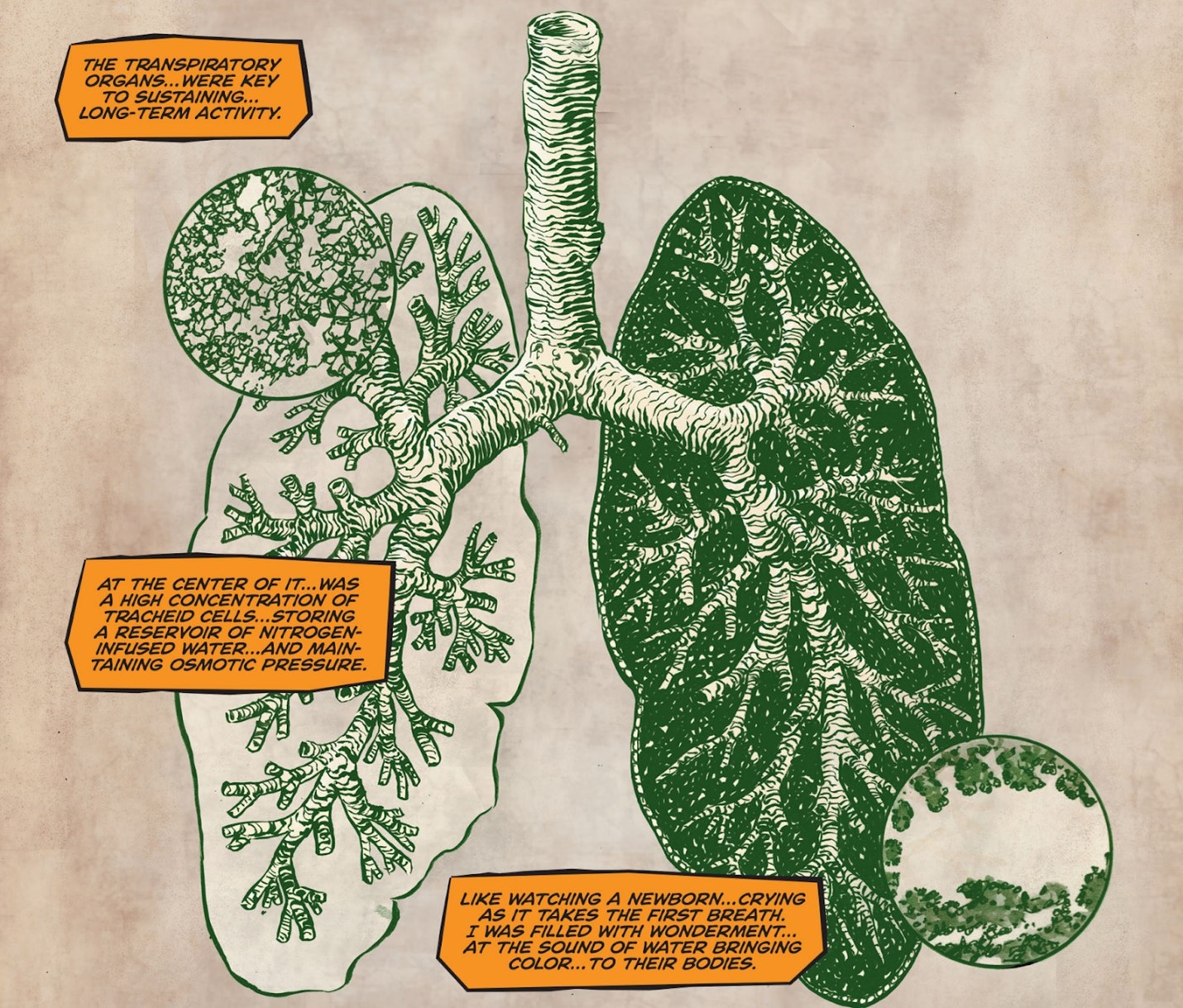 In this timeline, humanity is in remission. Through their fear and love of violence, the human race is on the brink of extinction. Humanlike plants who live under Father Green are left exploring the Earth. Each of these Swamp Thing-esque characters have their own personality traits that define them, and each of them has their own art style and core personalities that become very recognisable very quickly. The interactions between them and Father Green shows the respect between them, but Ram V uses the dialogue to patch some history and create new mysteries. As a collective, they are seeking the remaining tribes of humanity but each have their own individual goals and opinions. For instance, Indigo is the realist of the group who has a fairly poor view of humanity. Using their harmony with the green they commune with the trees to track humanity, but not all members are as motivated as others.
