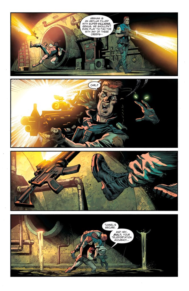 In the first issue, Amanda Waller – now back in the driver’s seat – sends a brand new Squad, with Peacemaker as their field leader, into Arkham Asylum to “recruit” Talon, the deadly Court of Owls assassin.
