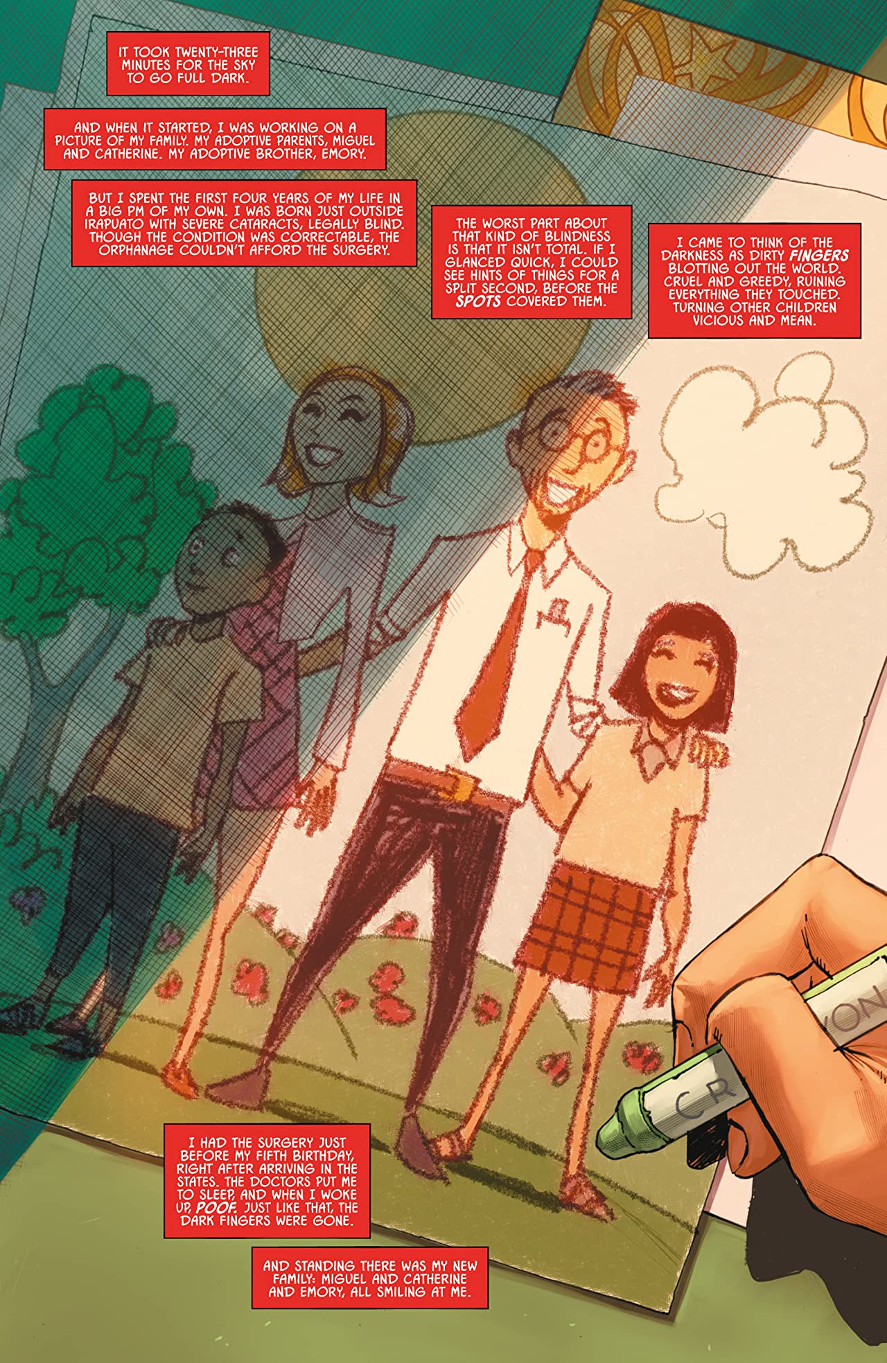 One thing I would say about our protagonists is they could easily be members of the Bat-Family. The way Val is written, the backstory, drivers and motivations, you could see her dropping into one of Snyder’s stories like Last Knight on Earth seamlessly. The same goes for her brother Emory; his skills with gadgets, their shared trauma, you could almost see him being an “Elseworlds” version of Robin where a young Lucius Fox dons the red suit. This is not meant to detract from them as characters in their own right, or to suggest that they’re derivative of other work, it is meant to point out that they really are so well developed and well written in the first issue that they could drop into a property with such a legacy as if they were always meant to be there.