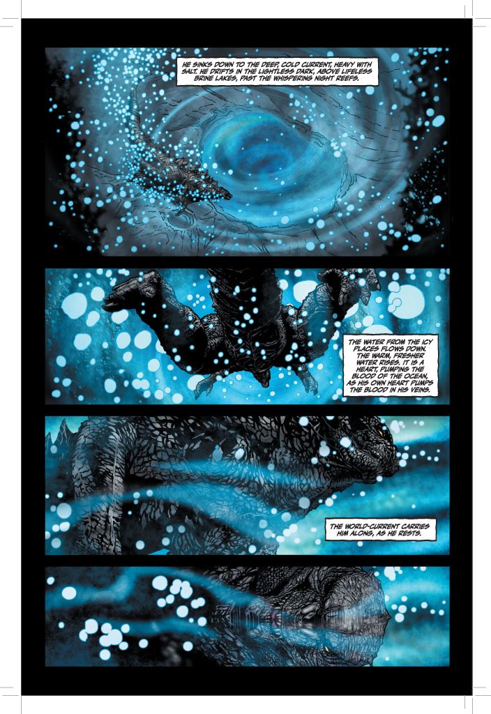 I’m also a big fan of the third-person narration used throughout, which gives some intriguing insight into Godzilla’s internal thought process and his understanding of the human world as a whole. There’s an almost Swamp Thing-esque feel to this narration at times, along with Godzilla’s role as ‘quiet protector of the balance’, and his ability to sense and feel the world’s ecosystem.