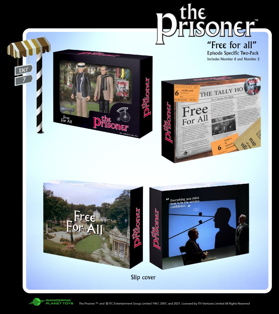 “FREE FOR ALL” TWO-PACK SET ($60 pledge). This 2-figure set features NUMBER 6 and NUMBER 2 (as played by Eric Portman). The accessories include NUMBER 6’s hat, bullhorn and election poster from the episode, as well as phones from NUMBER 2’s office.