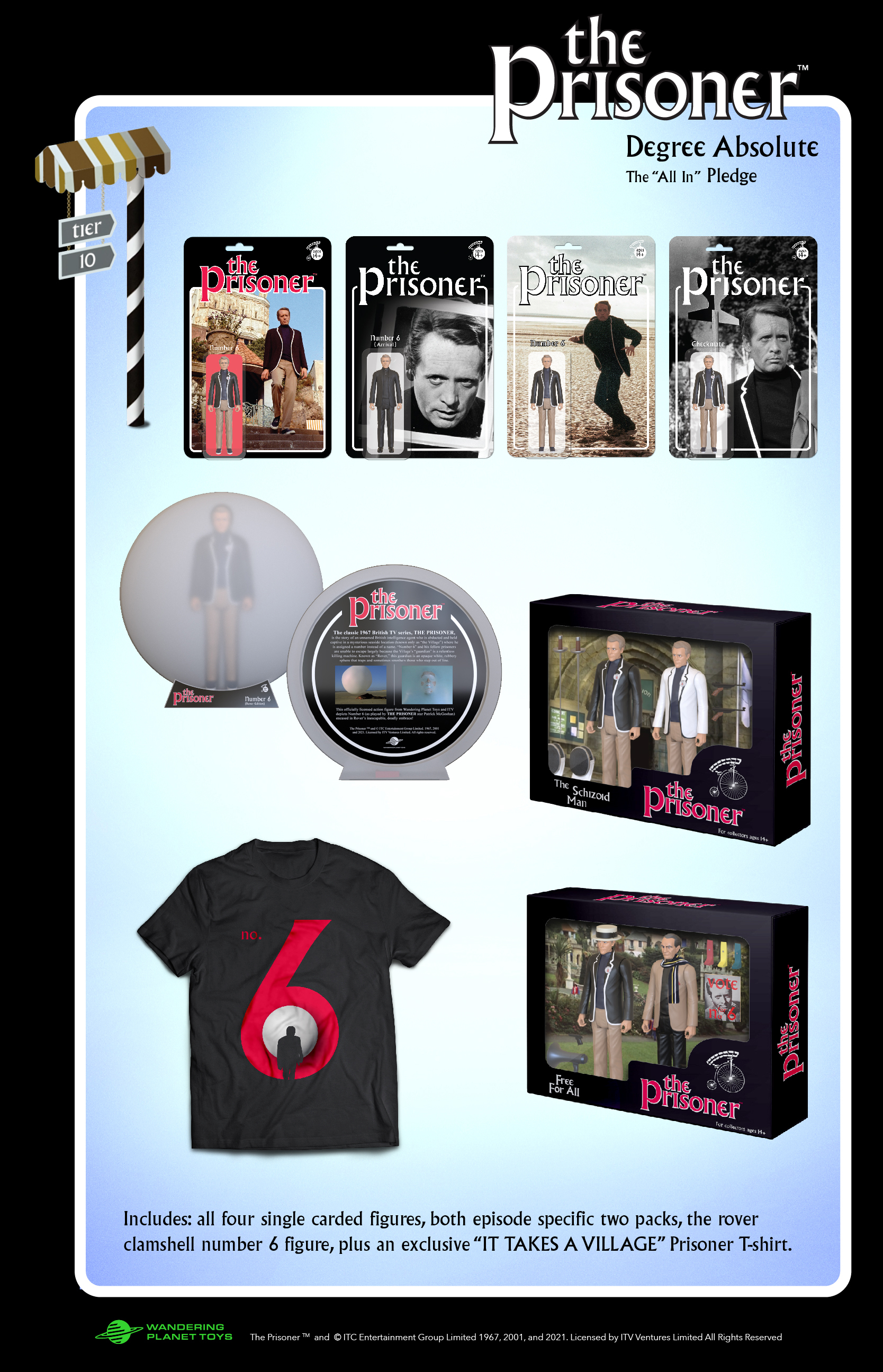 DEGREE ABSOLUTE – The “ALL IN” PLEDGE ($240 pledge) including an EXCLUSIVE Wandering Planet designed THE PRISONER T-Shirt. In addition to the full Wave One product line, backers will also receive an exclusive THE PRISONER T-SHIRT designed by Wandering Planet Toys.