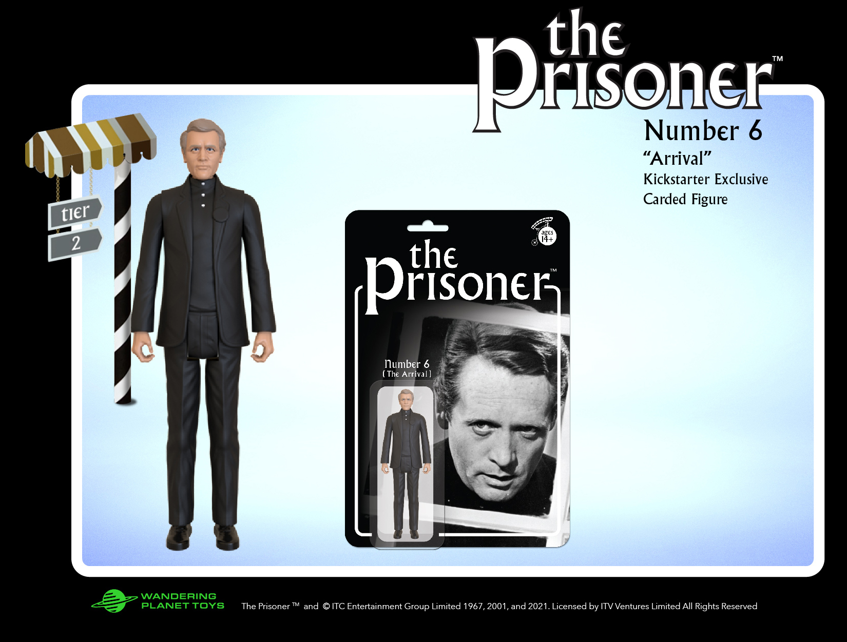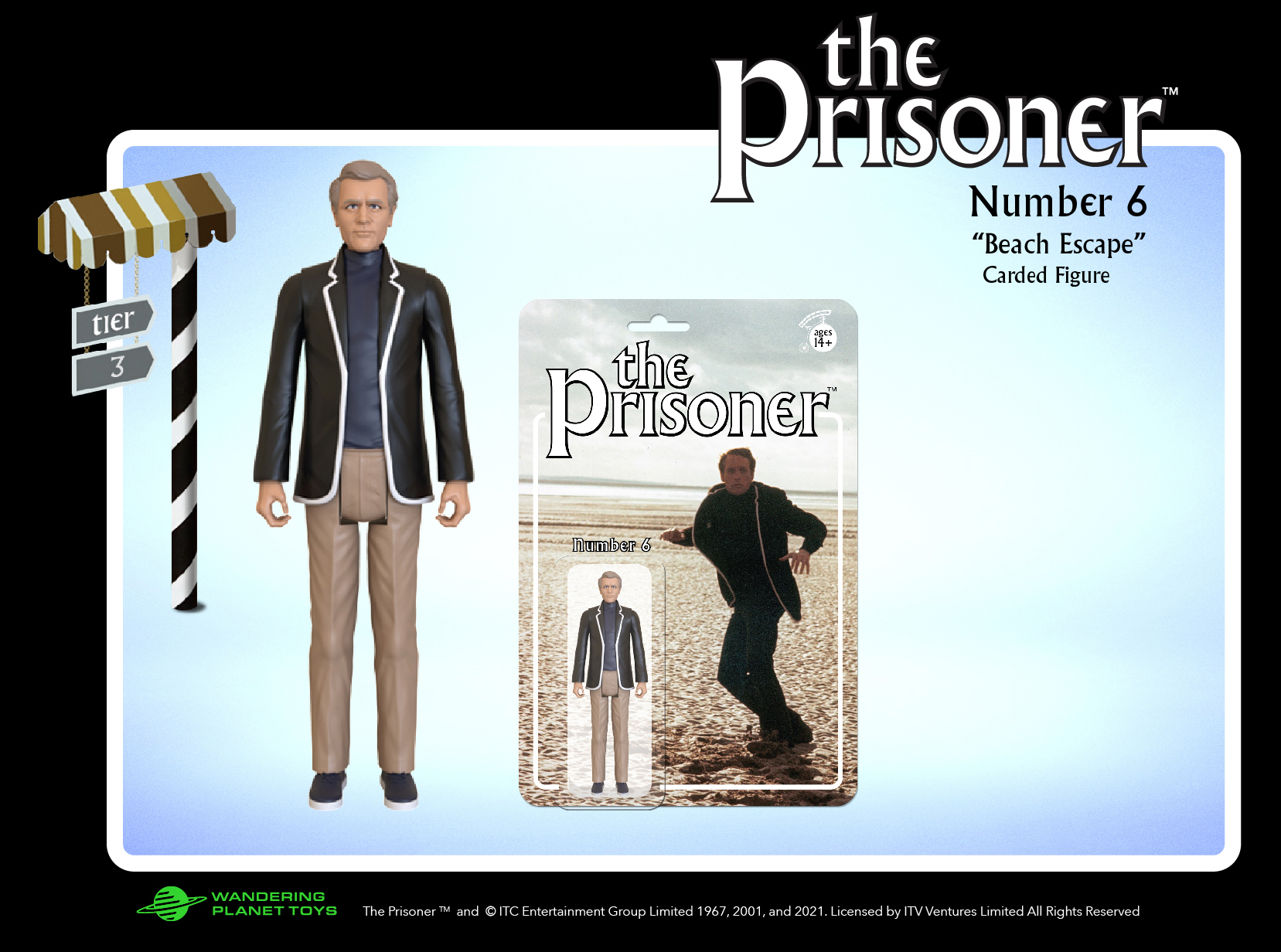 NUMBER 6 BEACH ESCAPE EDITION ($24 pledge) version of Number 6 is a variant of the First Edition figure, but WITHOUT the #6 badge. This edition features a special cardback featuring the icon moment of Number 6 attempts escape on the Village’s beachfront.