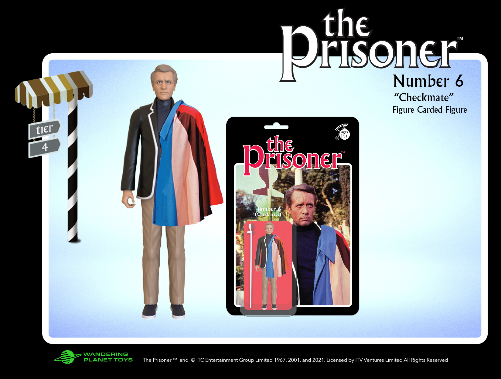 NUMBER 6 “CHECKMATE” EDITION ($24 pledge). This edition of NUMBER 6 figure sports the multi-colored cloak worn in during the living chess game in the episode “Checkmate” complete with the chess staff.