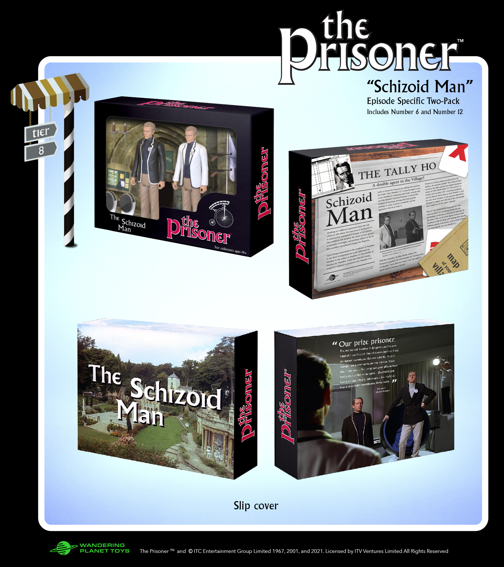 “FREE FOR ALL” TWO-PACK SET ($60 pledge). This 2-figure set features NUMBER 6 and NUMBER 2 (as played by Eric Portman). The accessories include NUMBER 6’s hat, bullhorn and election poster from the episode, as well as phones from NUMBER 2’s office.