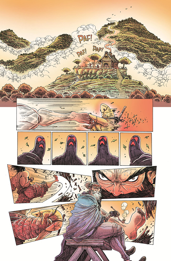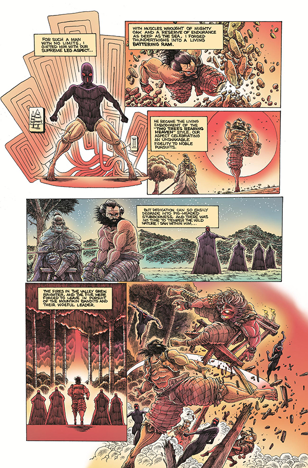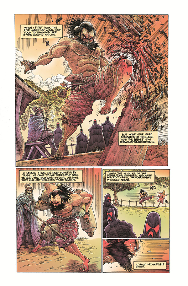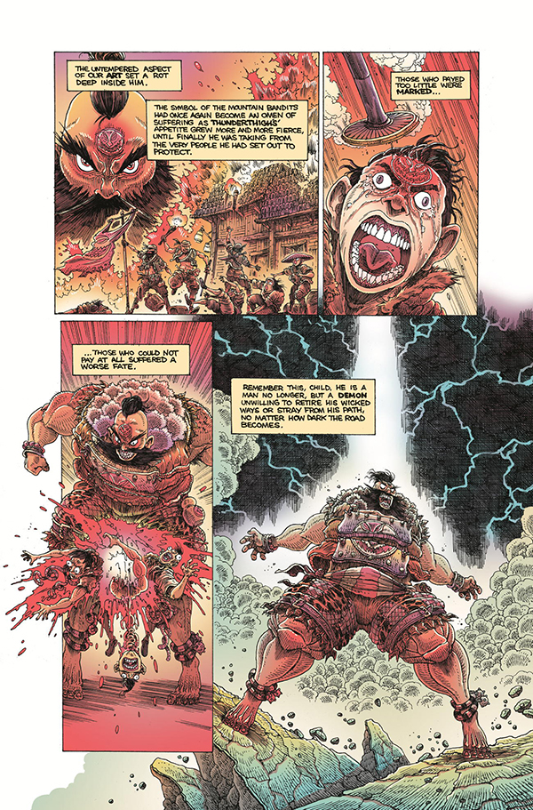 We kick off the second issue of James Stokoe’s love letter to Hong Kong action movies by digging a little into the origin story of Thunderthighs, his fall from grace and his slow, festering decline into beastdom. It’s all fun, tongue-in-cheek stuff, and gives Stokoe ample opportunity to flex his artistic muscle and play fast and loose with some classic Kung Fu cinema tropes.