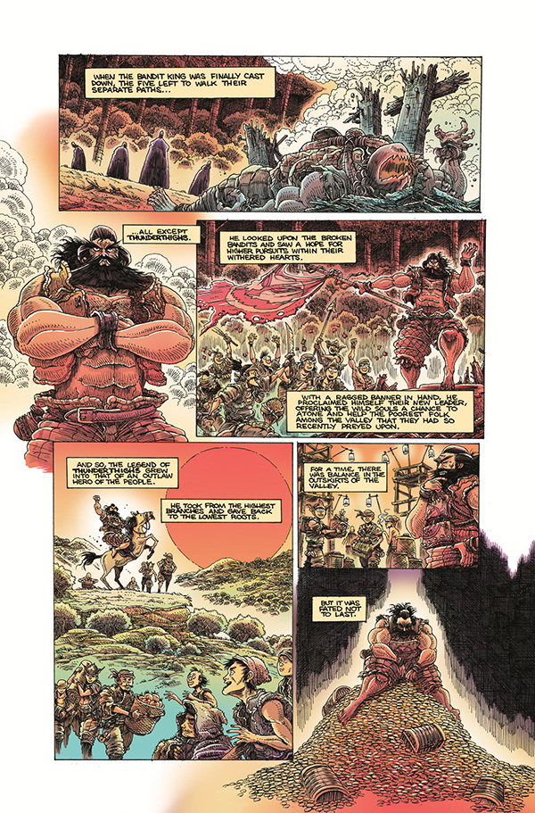 Okay, let’s take a moment, shall we? The first issue of Orphan and the Five Beasts introduced us to Mo, a young orphan tasked with ridding her valley of five demonic monstrosities. At the culmination of what was a fantastic opening chapter, we saw her come face-to-face (or should that be face-to-thigh?) with her first adversary, a hulking mound of quadriceps calling himself Thunderthighs. Up to speed? Alright, let the insanity commence…