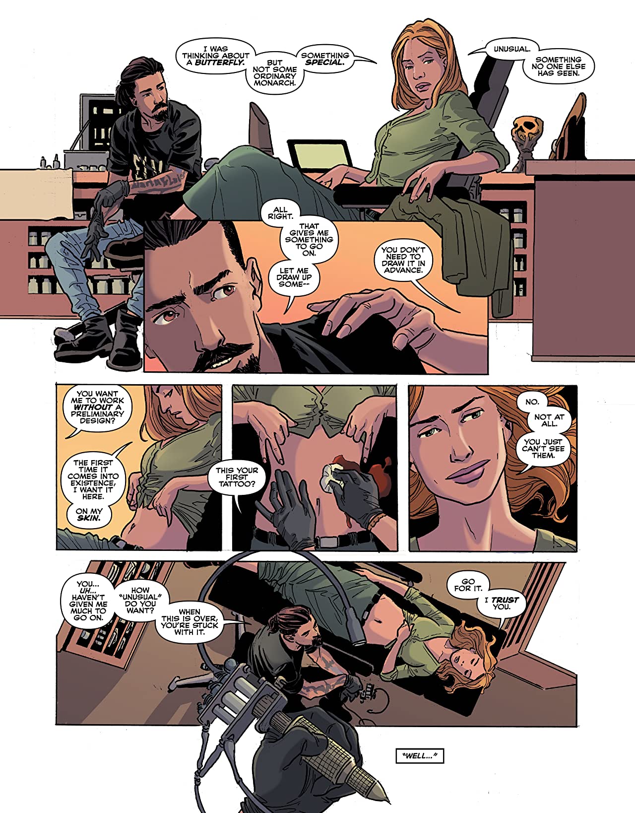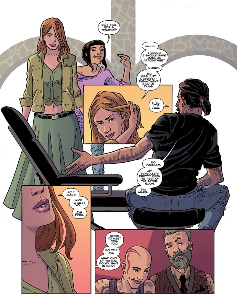 Niles is a tattoo artist of considerable skill but who is plummeting towards the edge. Having suffered immense loss and left feeling trapped or forced into the drudgery of repetition and guilt in his choices, something is desperately needed to free him. Fortunately, that opportunity arises in the arrival of Eden; an enigmatic woman whose desire for free hand work is the perfect remedy. Of course, with this being from AfterShock Comics, nothing should be taken at face value. Eden carries her own secrets, as well as the peculiar loss of her tattoos only days later. You’re cordially invited to consider love, loss, and horror here.