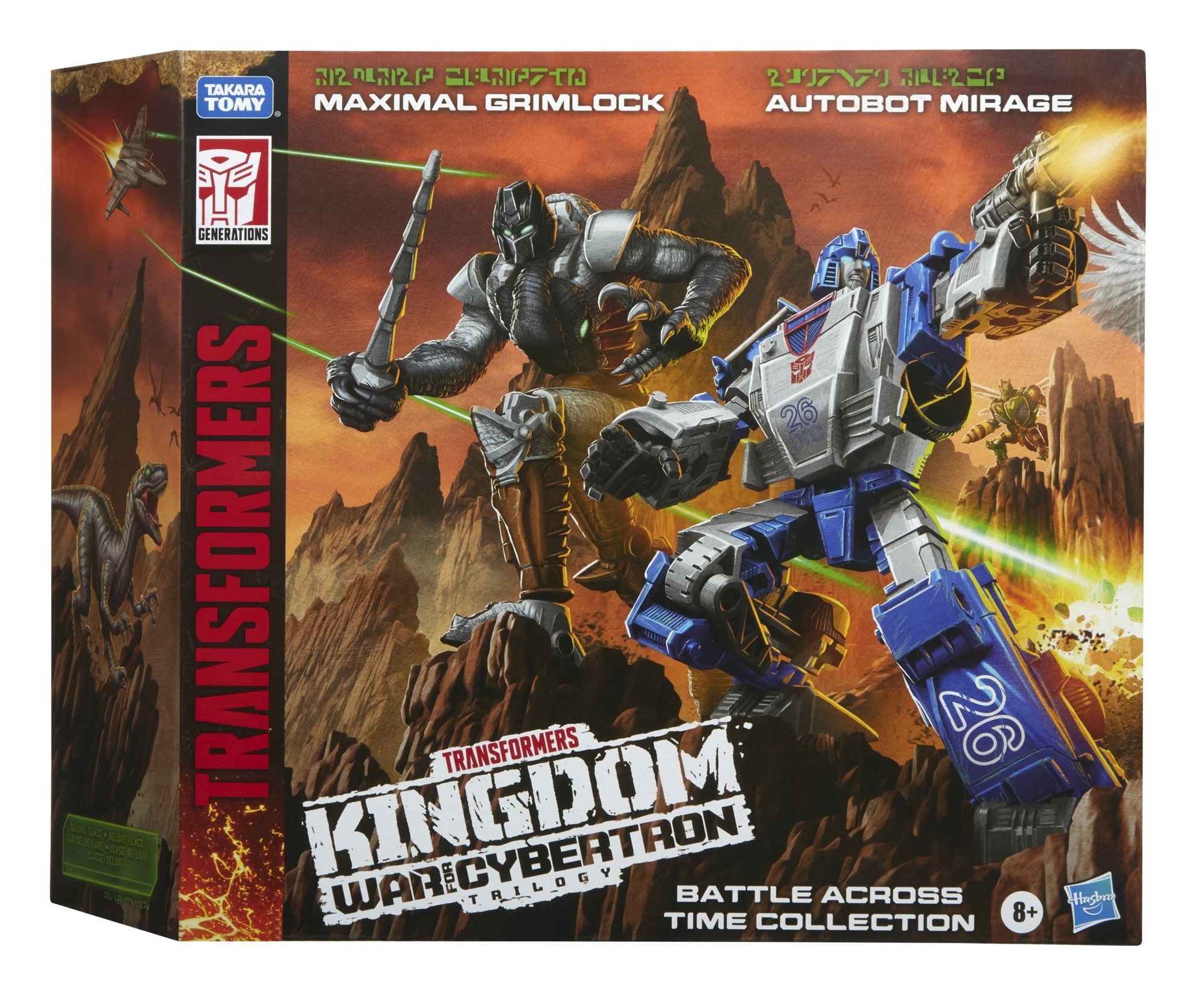 Includes Transformers Generations War for Cybertron: Kingdom Deluxe Class Autobot Mirage and Maximal Grimlock figures, 3 accessories, and instructions.