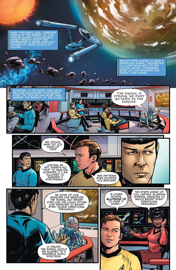 However, the book arguably gets off to an extremely shaky start as Easton pens the Tholian Bright Eyes somehow being able to hear “a repeating signal from the surface of Vulcan” which cannot be detected by any Federation sensors. To make matters even more unbelievable though, the crystalline entity is then able to pinpoint the precise location from which the sound is emanating to a mysterious beacon situated just outside the planet’s capital, and subsequently inadvertently activate the unknown device without being sucked back in time himself.