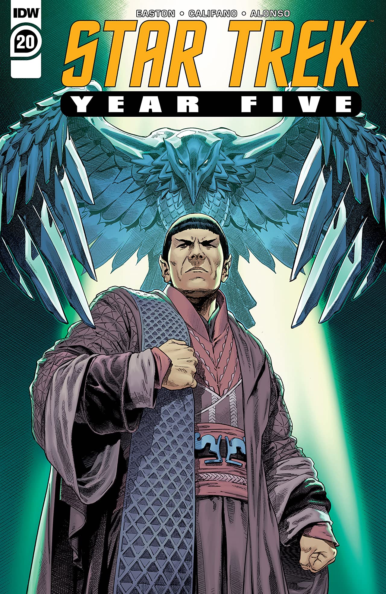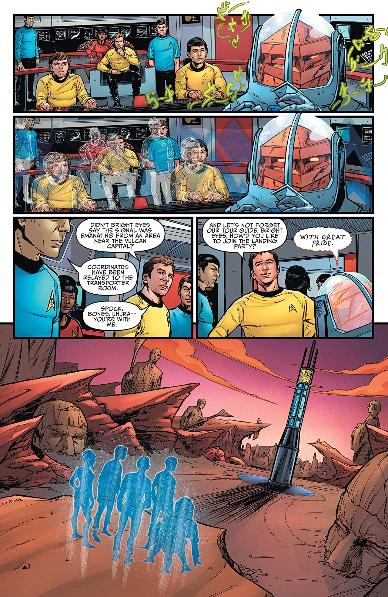 Likewise, Easton is not shy of adding some space-battle action to the proceedings by having artist Silvia Califano illustrate a seriously outnumbered U.S.S. Enterprise facing a large armada of Vulcan/Romulan hybrid starships. Just how Bright Eyes is able to partially protect Captain Kirk and his crew from the ravages of an altered time-line using tachyon particles is probably something best forgotten, but it does lead to an exhilarating chase sequence involving plenty of phaser blasts and the Constitution-class vessel’s colourfully-costumed bridge personnel being thrown all over the place.
