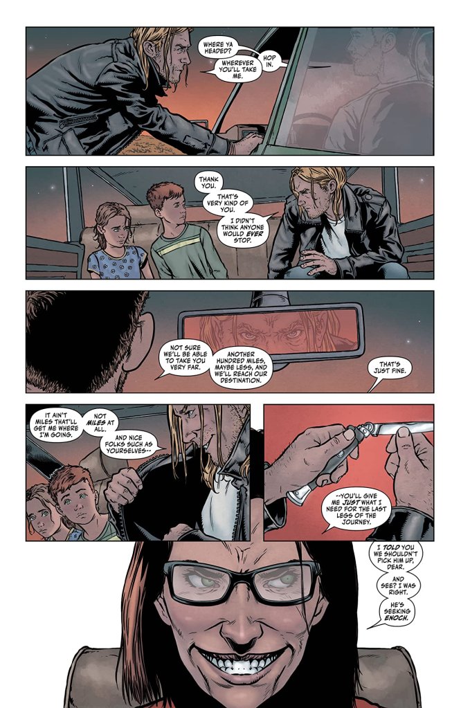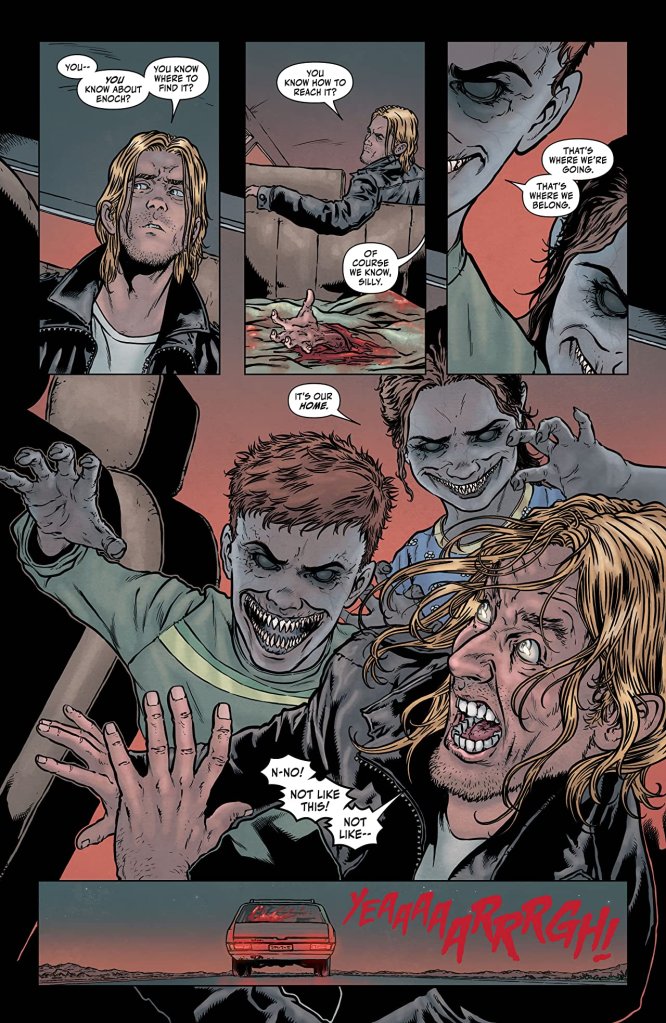 Similarly as successful in generating a sympathetic response for some of the grotesque farmer’s victims is Davis-Hunt’s absolutely awesome illustrations, and the way the artist pencils a pair of thrice-damned, fang-faced children as disconcerting flesh-devouring terrors. In addition, the effect of Enoch’s location straddling such a delicately-balanced cross-section of the universe is extremely well visualised by Davis-Hunt, due to his panels constantly switching the municipality back and forth between its current-day depilated state and when it was previously a bit of a boom town.