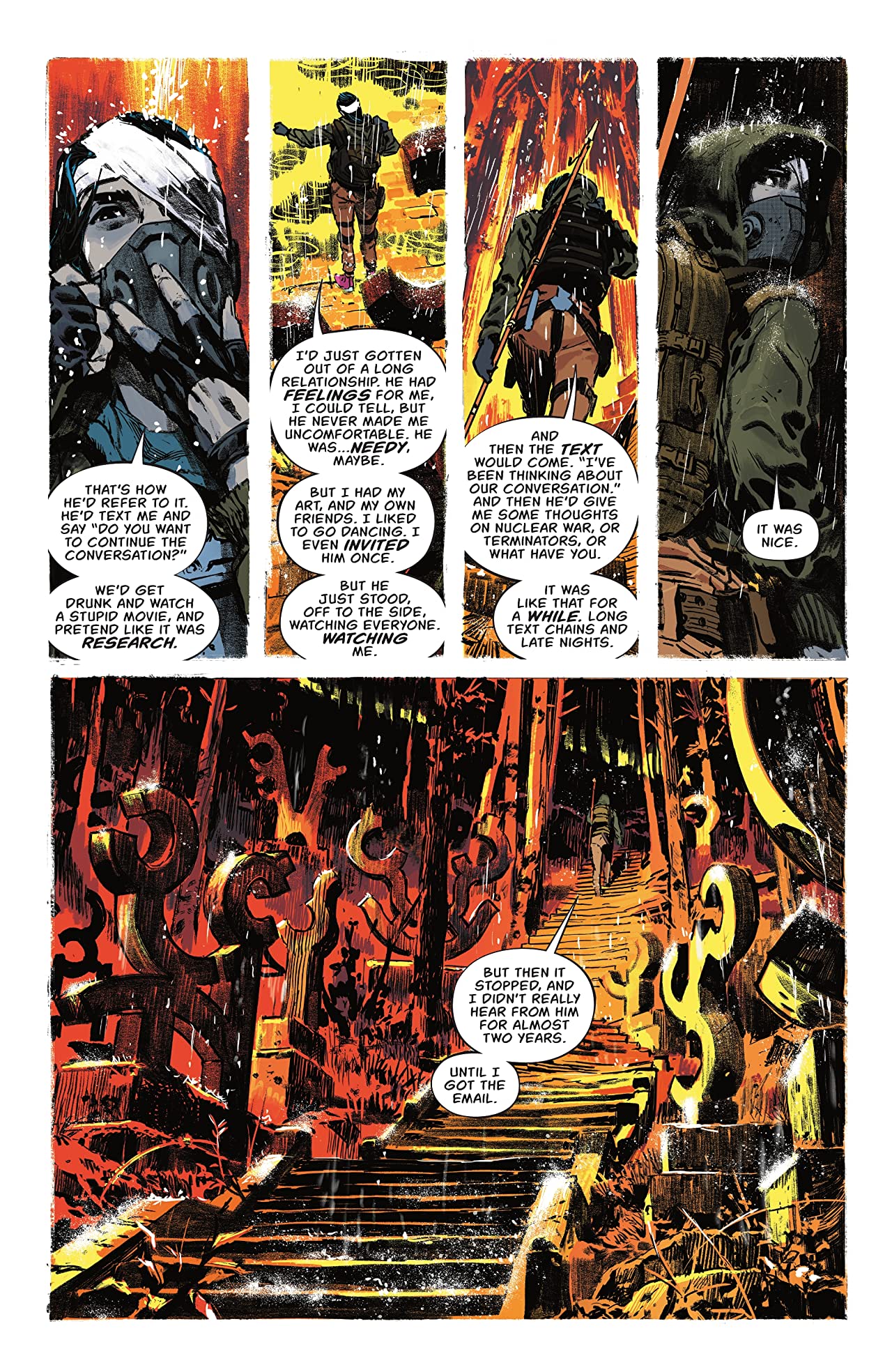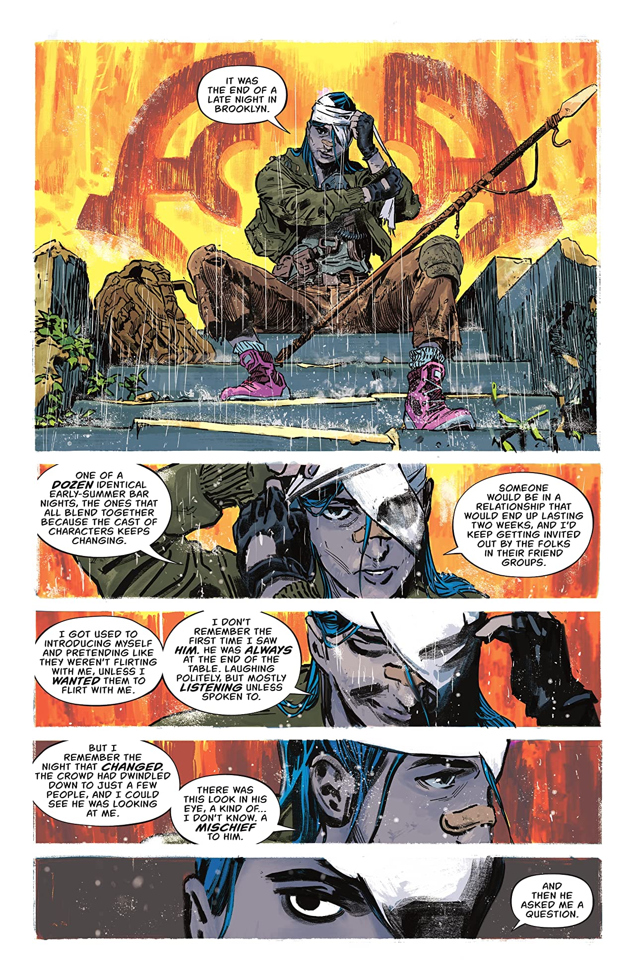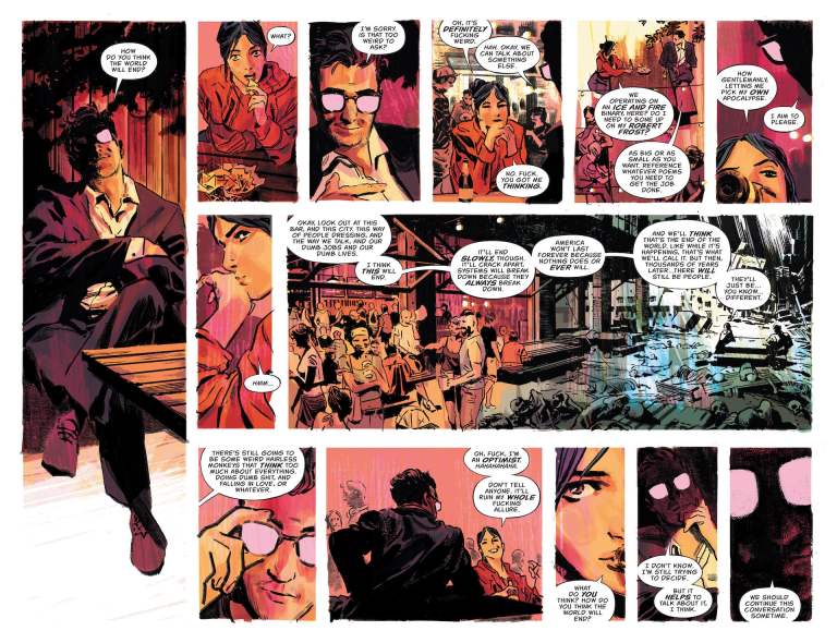 Again, no spoilers, but the execution here, both from Tynion and the impeccable artistic one-two punch of Alvaro Martinez Bueno and the Eisner Award-winning Jordie Bellaire, is nothing short of flawless. The cinematic framing throughout, along with Bellaire’s gradually shifting use of colour as the mundane ‘getting to know you’ chit-chat gives way to something else entirely is incredibly effective, with the final pages of the issue leaving us scrambling as the shock and horror of the situation sinks in.
