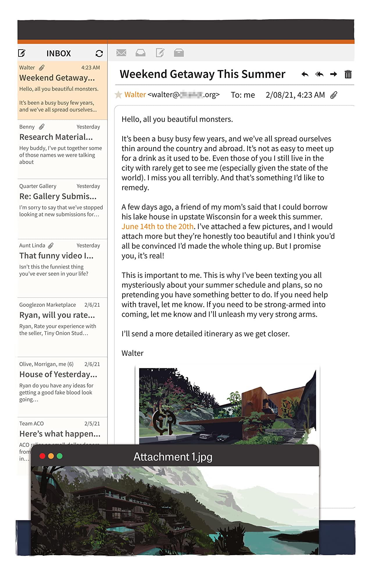 I’m still not going to delve too heavily into spoilers, but the first half of this opening issue introduces us to a wide-ranging cast of characters who find themselves invited to the titular lakehouse. Characters with diverse backgrounds and backstories, but who are all linked together by Walter. Y’see, everyone here knows Walter, whether he’s a recent acquaintance or an old childhood friend. And they’ve all been brought here for… well, they aren’t sure why, but with a house this nice, why wouldn’t you want to accept the invitation?